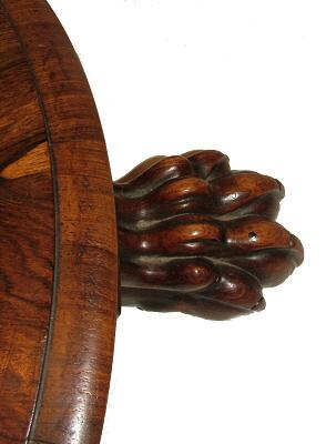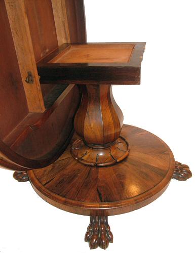 extremely well figured rosewood table, of tilt top action, is supported via an