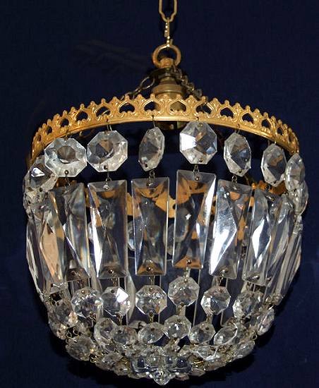 attractive brass fret crown and chains of hexagonal glass drops terminating