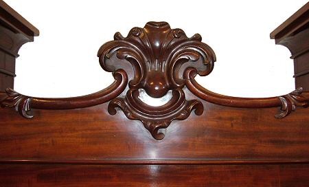 a bank of six graduated drawers surmounted by a carved foliate pediment. Flanking