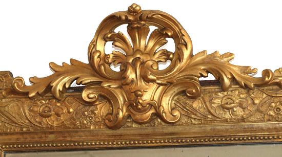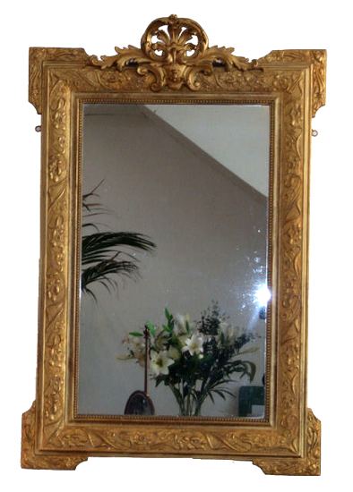 Circa late 19th Century a French Gilt Wall Mirror of Rectangular Outline. Circa Late 19th Century a French Gilt Wall Mirror of Rectangular Outline. A good size featuring an applied crest of scrolling acanthus leaves and Victorian Rococo detailing. The borders are very attractive with finely detailed vines and flowers. (Excellent original glass). Height 48" Width 31.5" £795 (Ref : MIR103) Email Us for a delivery quote : Click Here