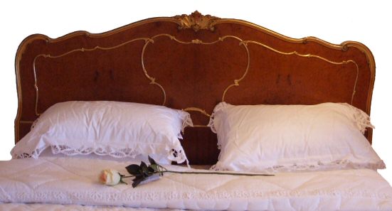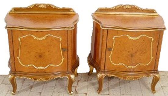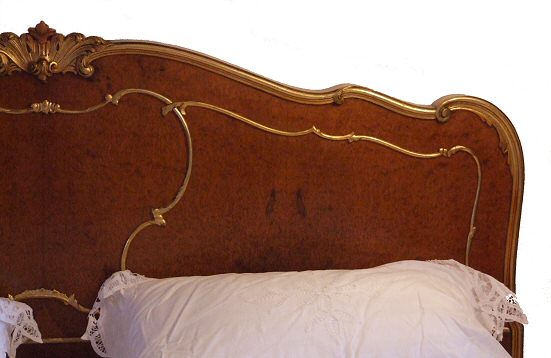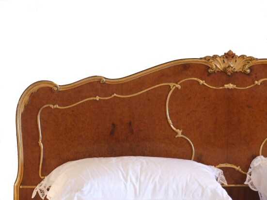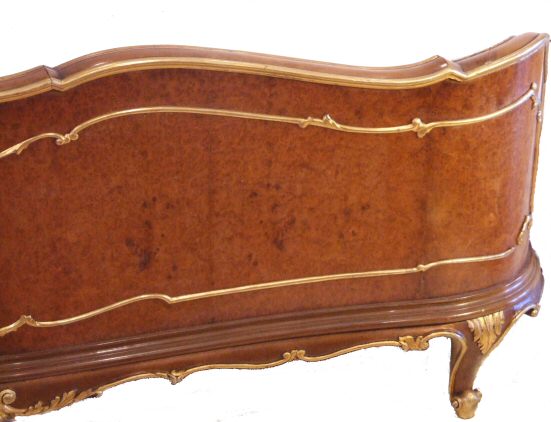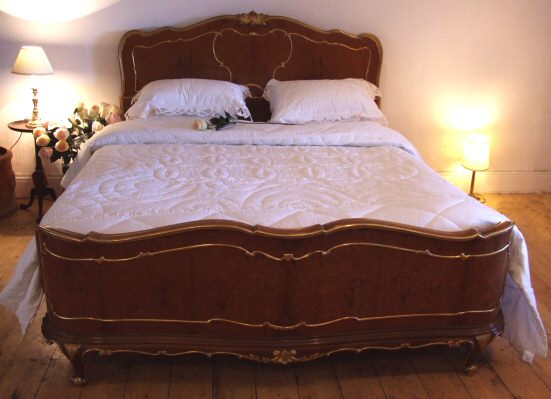 Fabulous Large decorative 1930 birds eye maple and gilt Venetian King size bed This absolutely stunning birds eye maple Italian Venetian King size bed bed will take a 6" matress. Large in proportions and stunning in detail the headboard is surmounted with wonderful acanthus detail picked out in beautiful gilt decoration. The bowed footboard having rounded edges and attractive cabriole legs all with beautiful gilt decoration. The wonderful rich honey colour is partly due to the birds eye maple and partly to the passing of time which has allowed this to mellow beautifully. This bed is truly stunning and certainly one of a kind. The bed rails are also in birds eye maple and have gilt decoration to their edges, this bed is easy to assemble and very sturdy. We have had new slats made and these are included in the price all you need to do is add the matress. We are fortunate to be able to offer you a wonderful pair of matching bedside cabinets also that work perfectly with this bed making it a fantastic set. The Italian bedside cabinets date to 1930 and are birds eye maple with gilt decoration. They stand on cabriole gilded legs and open to reveal a shelved area with the added benefit of internal drawer. Having beautiful gilded and shaped upstands these are certainly something special and complement the bed beautifully. Italian opulence at its best! More Photos to follow shortly Headboard: 54" High .