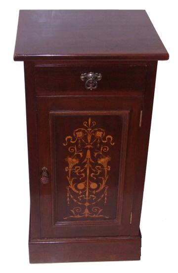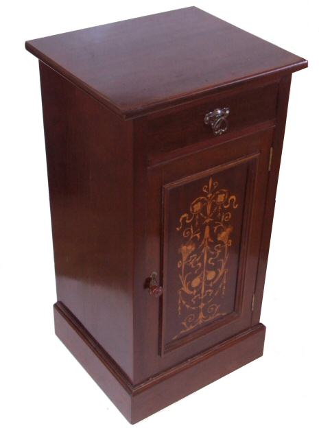 Attractive Edwardian Inlaid Mahogany Bedside Cabinet Dating to 1900 this lovely mahogany bedside cabinet has beautiful marquetry inlay to the door depicting floral ribbons and swags. The door opens to reveal a shelved area with useful storage and drawer above.