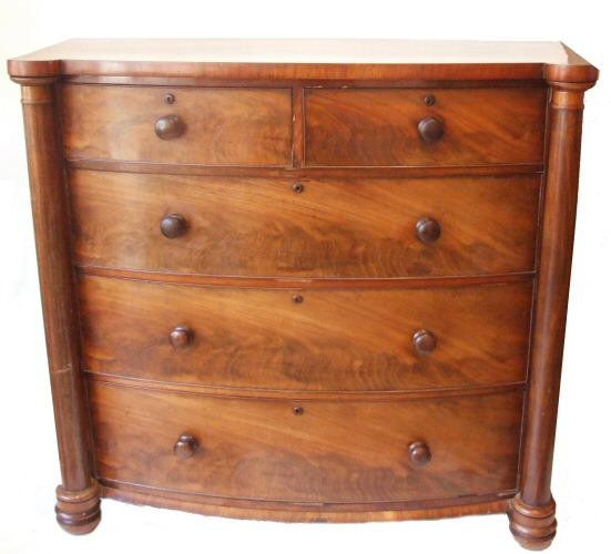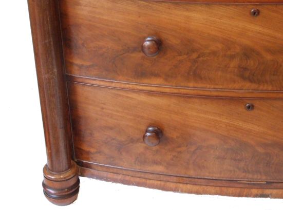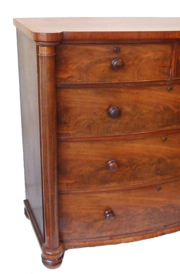 Early Victorian mahogany Bowfront chest of drawers A beautiful Victorian mahogany bowfront chest of drawers, 3 long drawers with 2 short drawers above, wooden knob handles standing on bun feet, beautiful honey colour with flame veneered drawer fronts, all runners checked and working well, lovely original condition. This attractive chest provides excellent storage space and is a beautiful mellow colour with attractive pillasters either side. Height 47" Width 49.5" Depth 29.5" SOLD Photographs taken pre workshop. (Ref:BED350) Email Us for a delivery quote : Click Here