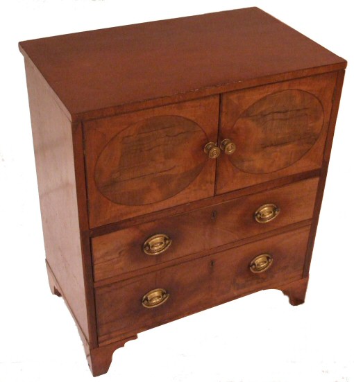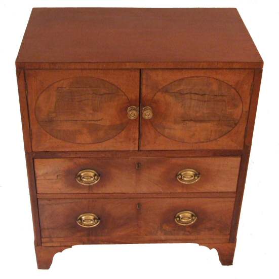 Regency Chest/Nightstand Circa 1800 a Georgian mahogany chest/nightstand of small proportions comprising 2 drawers with cupboard above with oval brass furniture (original) raised on bracket feet. The front having beautiful flame veneers with boxwood stringing. This extremely versatile piece can be used to house a modern hi fi system or for a Television with cupboard below to house the sometimes unsightly dvd player and gagets, the drawers are ideal for storing dvds and cds. This would also make a fantastic period bedside table.