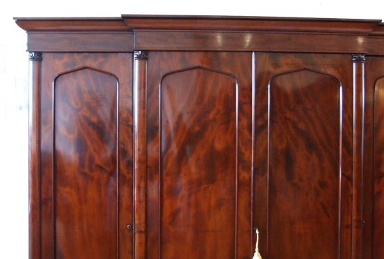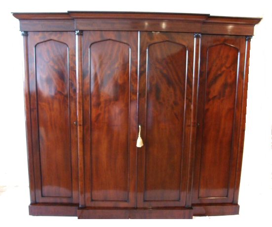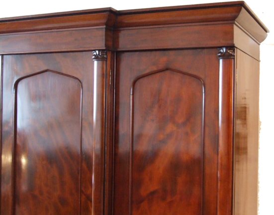 Stunning Victorian door combination wardrobe A truly beautiful example of a mid 19th Century Victorian 4 door mahogany wardrobe. This lovely wardrobe of breakfront outline features 4 matching doors each with superb mahogany flame panels terminating in Gothic arches to their tops. The doors are flanked by shallow moulded pillasters each with carved foliate capitals. Above is an imposing cornice again featuring figured mahogany whilst the whole is raised on a plinth. Excellent condition each door with fully working locks the whole lined in cream calico. The 2 end sections consisting of full hanging space with 3/4 hanging central section above a deep drawer. Hard to find in 4 door version. This lovely antique wardrobe divides into 5 sections for ease of transportation and installation. Height 80.5" Width 92.5" Depth 28" max Internal depth 19.75" both end sections by 19.25" wide by 67.75" high Internal depth of central section 21.75" by 44.5" wide and 54" high