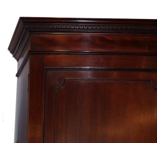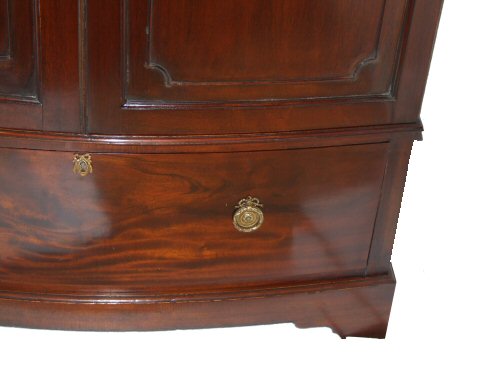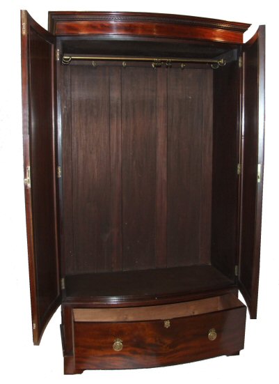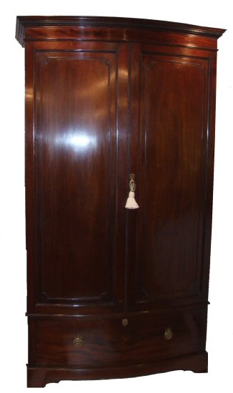 Edwardian mahogany bowfront wardrobe An attractive mahogany Edwardian bowfront wardrobe with full hanging. The 2 bowfronted doors feature recessed panels with applied fine bead moulding, whilst below is a deep bowfront drawer with pretty solid brass handles with ribbon swag decoration. The whole surmounted by dentil cornice and raised on a bracket foot plinth. Lovely warm conker colour. This wardrobe comes in 3 pieces for ease of transport. Height 80.5" Width 45.5" Depth 19.5" internal depth 16.5 to 19"at bowed point (Ref :BED368) Email Us for a delivery quote : Click Here