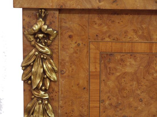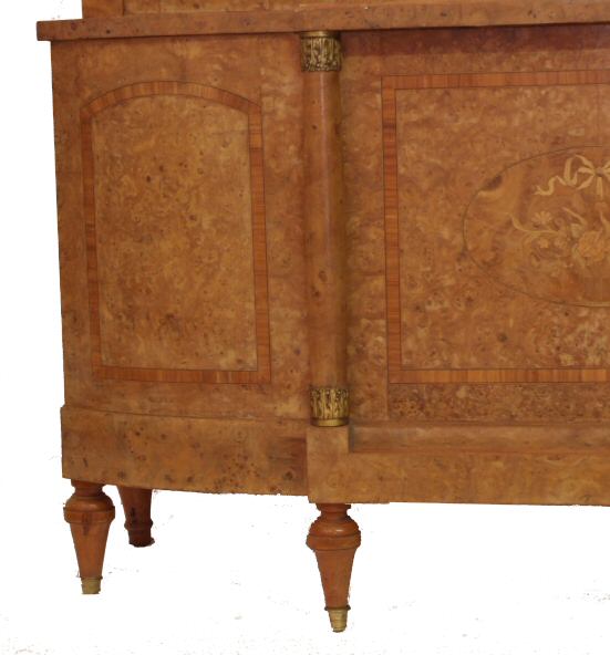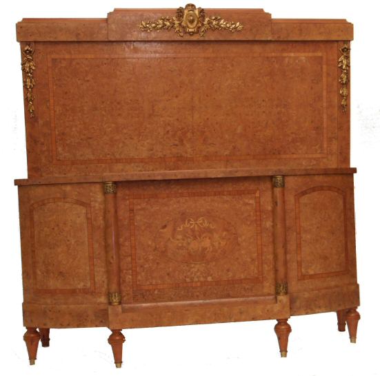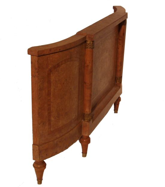 Stunning Edwardian French Birds Eye Maple Double Bed Circa 1900 an abolutely superb example of a French burr Birds eye maple douoble bed with ormolu mounts. This gorgeous example features a high headboard with attractive foliate ormolu mount. Flanking the bed either side there are large foliate mounts matching the central piece. The footboard of bowfront outline, divided into 3 sections by pillasters each with brass foliate capitals, the central panel with beautiful floral marquetry . The whole bed veneered in the best possible quality birds eye maple burr and further enhanced by tulip wood banding. The whole raised on tapering turned supports being brass capped. A lovely honey blond colour in beautiful condition, supplied with new slats ready to take a standard 4'6" matress.