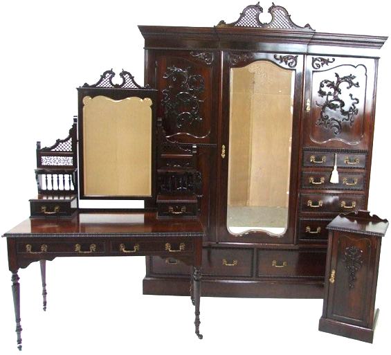 This stunning Victorian Rosewood Bedroom suite is by Maple and Co of Paris and the quality is superb. Consisting of a large combination wardrobe, dressing table and bedside cabinet it represents excellent value for money and the whole suite has been through our workshops and is in wonderful condition with all the locks working and runners checked. The wardrobe divides into 4 sections for ease of transport, 2 large deep drawers to the base with a full hanging section to the left hand side and 4 drawers with cupboard above to the right. The cornice has wonderful detailing and the swan neck pediment is fretted to match the fret work to the top of the dressing table. The whole is in rosewood and a lovely deep dark rich colour with complementary brass handles of rococco design. We have lined the wardrobe with a cream calico to make sure that the interior is as impressive as the exterior. Height 92" max Width 76" max, the body measuring 72" Depth 23" max, body 21" and internally 19" This whole suite oozes quality and the makers label of Maple and Co can be found on the back of the wardrobe and dressing table. The panels are embelished with acanthus detailing and pretty floral relief work. The depth of this wardrobe makes it ideal for use with modern day hangers, plus the added benefit of a central bevelled door ( a small amount of foxing can be seen on the wardrobe door but nothing detremental, just a few flecks to add to the character of this wonderful piece). The dressing table is full of beautiful detail from the spiral turned slender legs to the upstands which have the feel of Chinese Chippendale along with the lovely fretted pediment to the top of the dressing table. The dressing table itself has 2 deep drawers to the base with 2 useful jewellery drawers to the upstand. Height 71.5" to the top of the pediment Width 47.5" Depth 24" The bedside cabinet is of similar feel having the same detailing to the door, acanthus with floral accents. The drop brass handle works well and opens to show a shelved interior. Height 33" Width 15" Depth 15" SOLD (Ref : BED50) Email Us for a delivery quote : Click Here