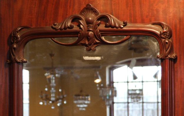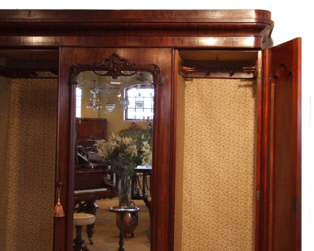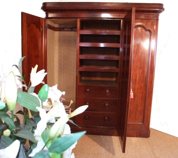 Stunning Victorian Mahogany Combination Wardrobe Circa 1860, a superb example of a Victorian Mahogany Combination Wardrobe. Beautiful deep rich mahogany doors with central mirror door, the original mirror in excellent condition. The central door opens to reveal a beautiful fitted interior consisting of a chest of drawers with linen trays above all running smoothly. Flanking this are 2 full length hanging sections with small drawers below. The whole will be relined in cream calico before delivery. Presented in excellent condition, this lovely wardrobe divides into 5 sections for ease of moving and is a lovely example of an antique combination wardrobe with design for maximum storage. Further photos to be added once this wardrobe has been through our workshops