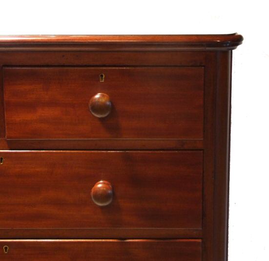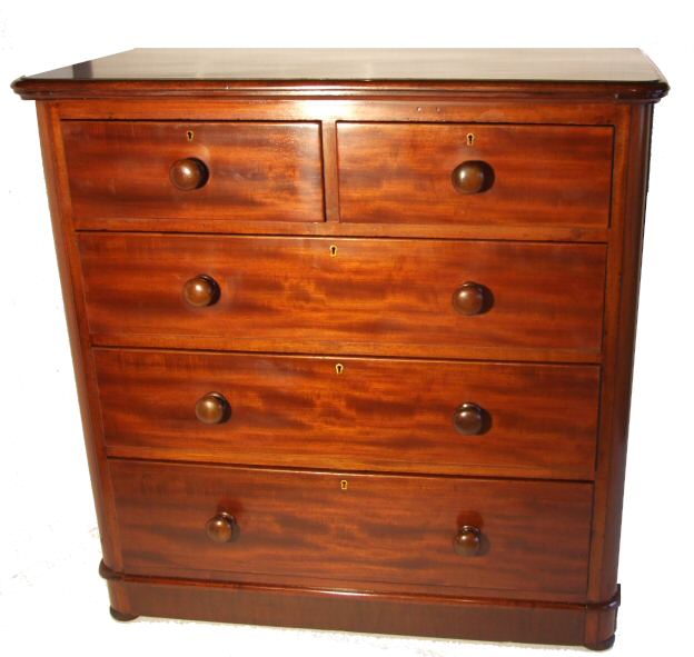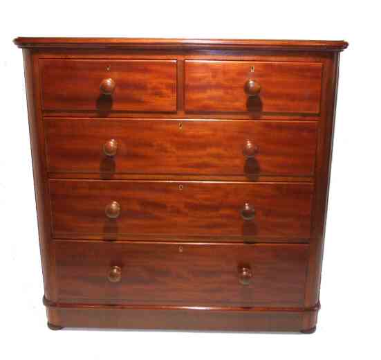 Victorian mahogany chest of drawers A lovely Victorian chest of drawers of 3 plus 2 design with wooden knob handles raised on small bun feet. Presented in excellent condition having been through our workshops to ensure all drawers run smoothly, the liners have all been checked and the entire chest has been traditionally French polished so it is in beautiful condition. Height 42" Width 41.5" Depth 19.25" Price £695 Email Us for a delivery quote :Click Here (Ref :BED513)