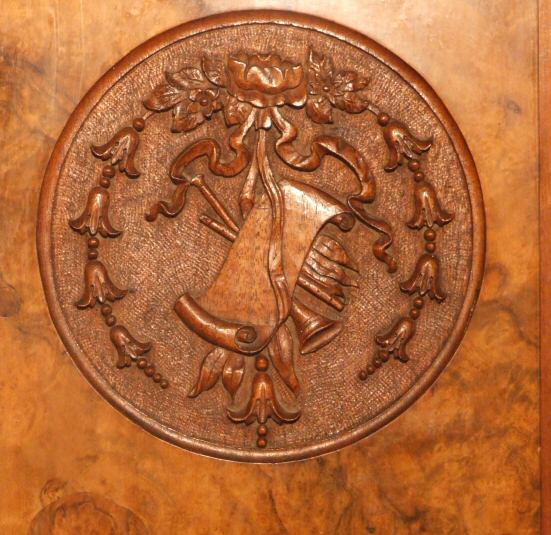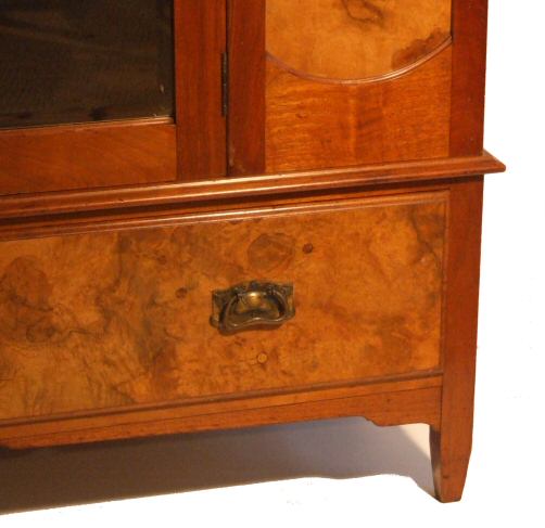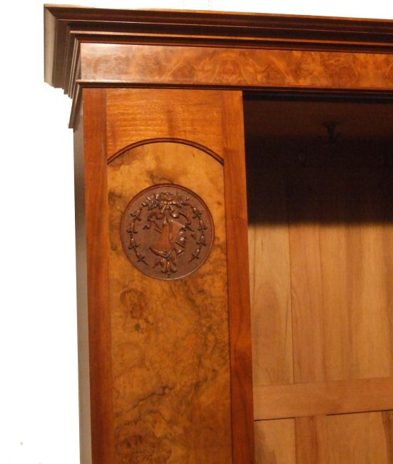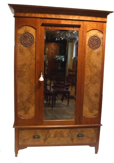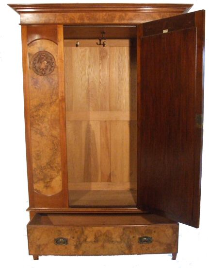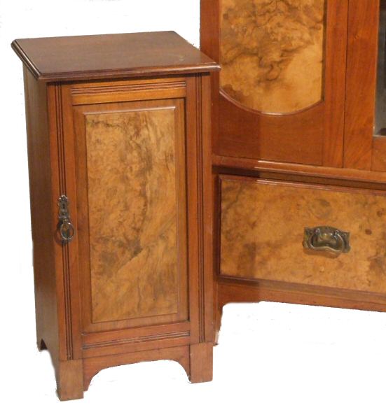 Beautiful Edwardian walnut full hanging wardrobe A lovely example of an Edwardian full hanging wardrobe in walnut with wonderul flame burr walnut panels to the door fronts. The wardrobe divides into 3 for ease of transport and can have either one or 2 brass rails fitted according to your specifications, the width of this wardrobe allows for 2 rails to be fitted from front to back to allow for maximum storage. The door has original bevelled mirror in excellent condition and this section stands above a deep blanket drawer on tapered feet. The body of this wardrobe has attractive carved panels to either side depicting music scrolls with horns and bellflower decoration. In excellent original condition this oak lined wardrobe is excellent quality and comes with fully working lock and key. We do at present have a bedside cabinet (Bed:518) which is photographed above that is a perfect match for this wardrobe so if you are quick you could purchase both items together (£595 for the wardrobe £175 for the bedside cabinet) Height 79.75" Width 53.75" at cornice 46.5" main body Depth 17.75" int 16.75" (Ref :BED520) Email Us for a delivery quote : Click Here