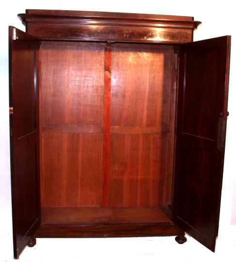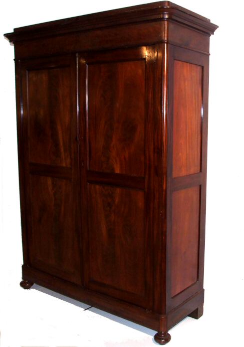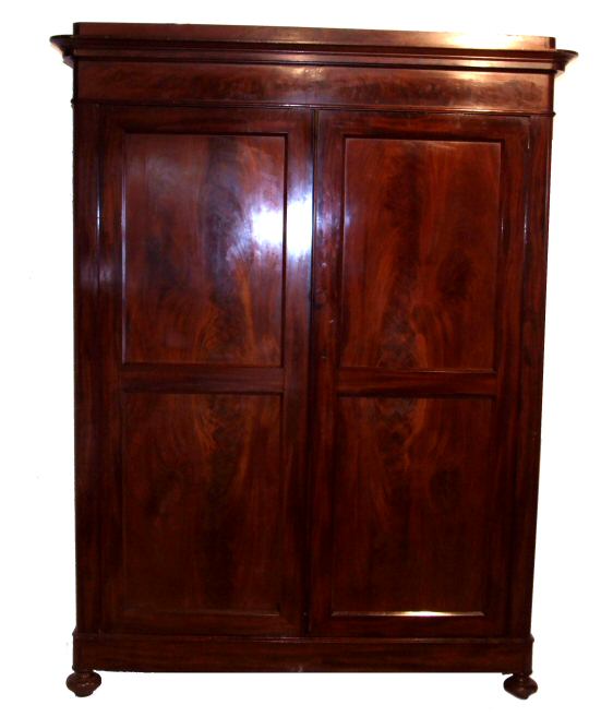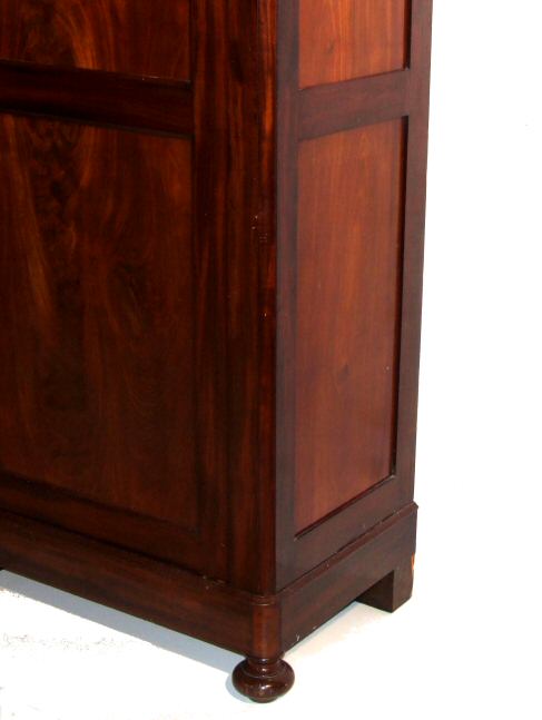 Fantastic Early Victorian French full hanging wardrobe A fantastic Early Victorian French highly figured mahogany wardrobe with excellent flame veneers to the doors. The whole standing on ring turned bun feet dissassembles fully into flat sections making it perfect for those tricky staircases and awquard areas. This wardrobe bolts together with the original coach bolts and provides an excellent sturdy wardrobe with vast area for full hanging (brass rails to be fitted ). This is a beautiful rich colour and is provided in excellent condition. Height 81.5" Width 62.5" at cornice, the main body being 57.25" Depth 19.5" but 22.25" at the cornice internal depth 17.5 by 64" H by 55.25" deep (Ref :BED521) Email Us for a delivery quote : Click Here