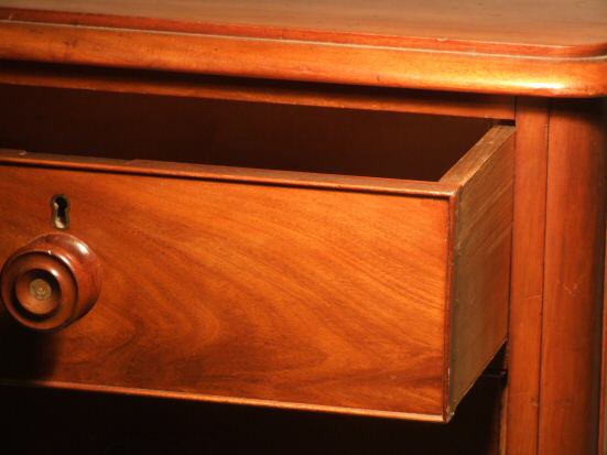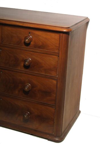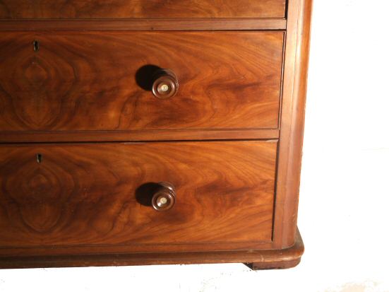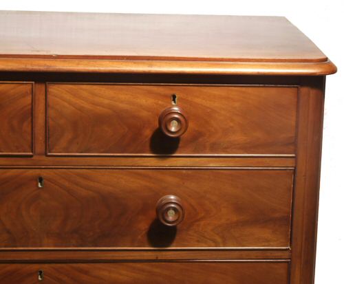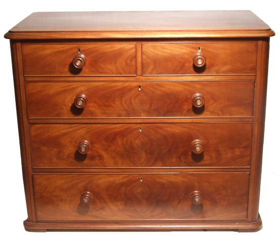 Victorian mahogany chest of drawers A lovely Victorian chest of drawers of 3 plus 2 design with turned wooden knob handles with mother of pearl insets. The flame mahogany drawer fronts having cockbeading to their surrounds. Presented in excellent condition having been through our workshops to ensure all drawers run smoothly, the liners have all been. Height 38.5" Width 45.5" Depth 23.5" Price £795 Email Us for a delivery quote :Click Here (Ref :BED524)