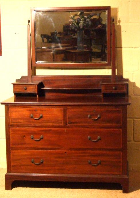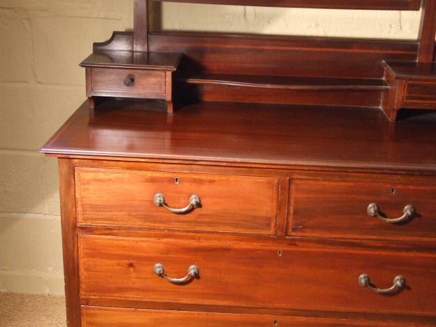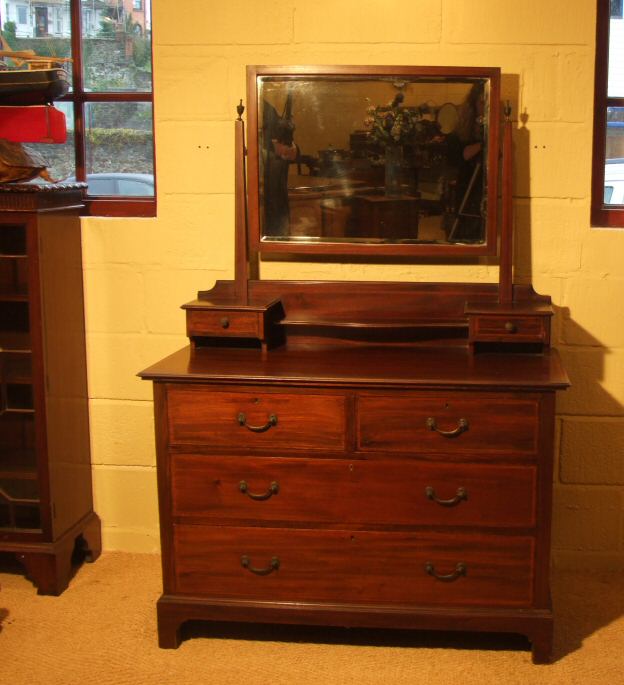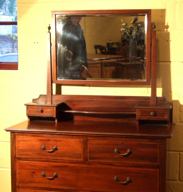 Edwardian inlaid mahogany dressing chest Circa 1900, an Edwardian inlaid mahogany dressing cest, this inlaid mahgany example features a 4 drawer chest of rawers nbracet pinth with 2 drawer and swivelling mirror superstructure above. The mirror in very good condition for age flanked by brass finials which match the brass drop handles. Banded in satinwood and in good original condition. H 64" W 45" D 20.5" Price £125 (Ref:Bed526)