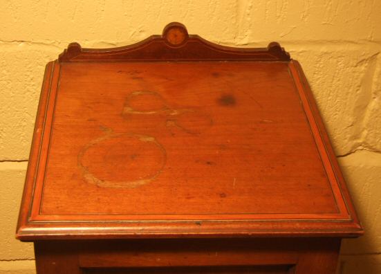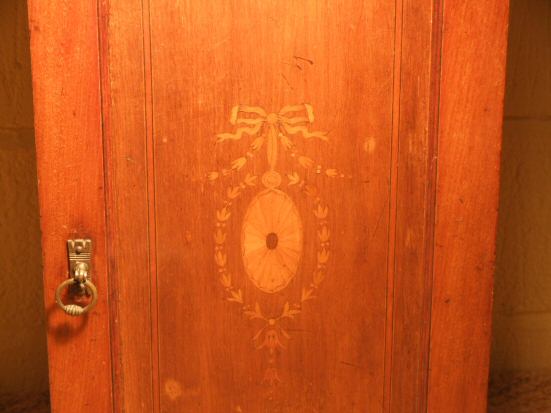 Edwardian inlaid mahogany bedside cabinet A pretty Edwardian inlaid bedside cabinet thee single panelled door with an oval fan inlay surmounted by flowering ribbon with swags of bellflowers. The door and top banded with satinwood, boxwood and ebony stringing and corresponding rear upstand with oval inlay decoration to the back. The door opens to reveal a shelved interior. A lovely cabinet in overall good condition but with marks to the top. H 32.5" W 15.2"" D 15.25" Price £125 (Ref:BED527)