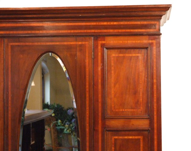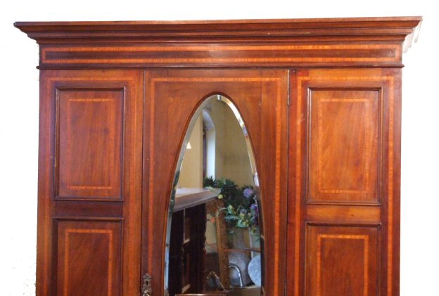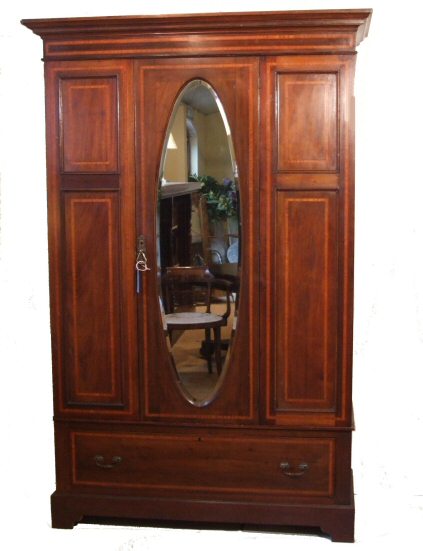 Edwardian inlaid mahogany wardrobe A beautiful example of an Edwardian inlaid mahogany wardrobe. The whole decorated with satinwood banding and a lovely colour in excellent original condition. The original oval mirrored door in excellent condition. The interior is fitted with 6 original hook and 2 brass rails running from back to front. The wardrobe comprises of 3 sections, the base being a full width drawer, the body housing the hanging section and the cornice. H 79.25" W 51.5" at cornice and 46.75" the body Depth 19.5" at cornice, 16.75" body depth externally Internally 14.75" deep x 46" wide x 53.25" high £795 (Ref:Bed528) Email Us for a delivery quote : Click Here