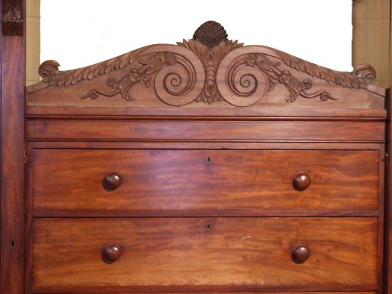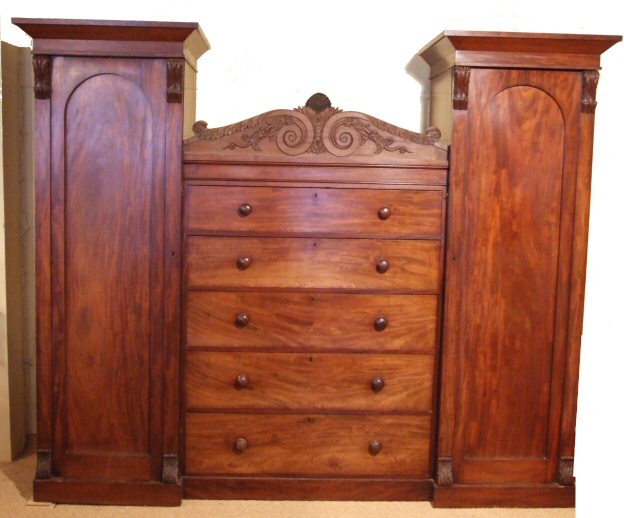 Fabulous mahogany 19th Century combination wardrobe A beautiful example of a 19th Century combination wardrobe. The whole divides into 7 pieces for ease of transport. The central section consisting of 5 full width deep drawers with wooden knob handles providing excellent storage space. This sits in a plinth and is flanked either side by 2 full length hanging compartments, brass rails fitted. These hanging sections have cornices to their tops and the central section has a beautifully carved foliate pediment. More photos to be added once this has passed through the workshops Dimensions tbc £1,995 (Ref:Bed529) Email Us for a delivery quote : Click Here