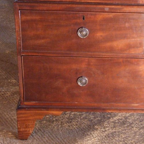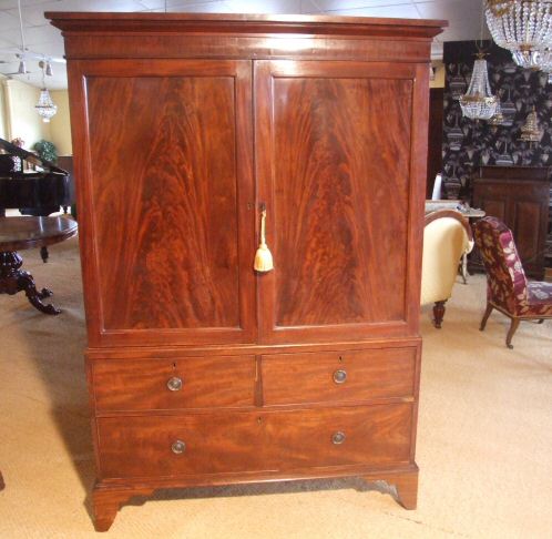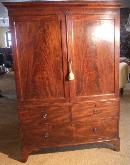 19th Century mahogany Wardrobe A stunning 19th Century Wardrobe of short proportions making it ideal for any home where ceiling height it a problem. The highly figured panelled doors open to reveal hanging space of 44" wide by 18.5" deep. This lovely wardrobe is in 2 sections making it easy to transport. The lower section consisting of one long drawer with 2 smaller drawers above. Attractive circular brass drop handles dress this lovely piece. The top section will be lined in cream calico included in the price and further photos will be added once the wardrobe has been through the workshops. H 6 Ft D at cornice 22", body being 20" Width 50" at widest point £2,200 |