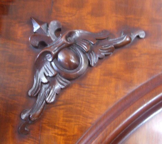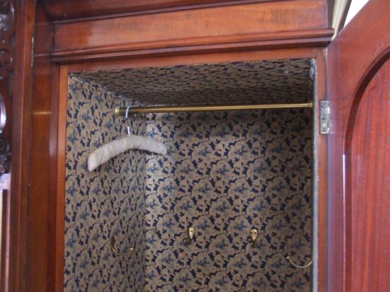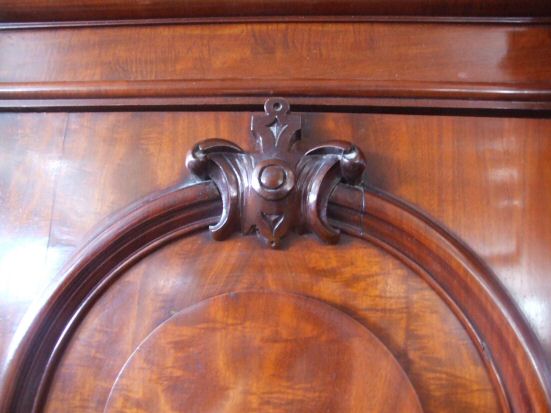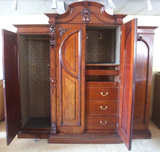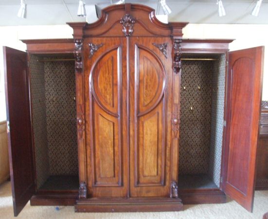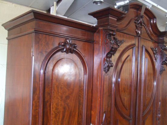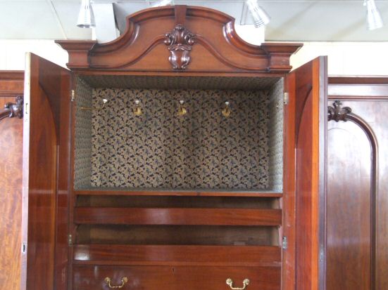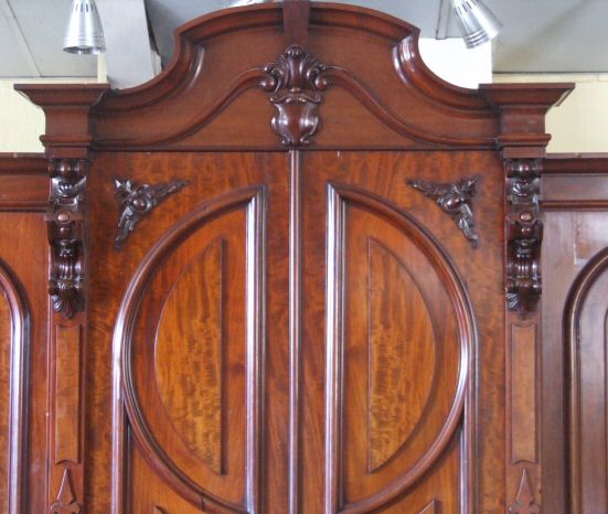 Striking Early Victorian flame mahogany combination wardrobe A truely magnificent example of an Early Victorian combination wardrobe dating to 1850. The whole is in wonderful original condition with gorgeous blue and cream original lining all in excellent condition. The wardrobe itself comprises of 5 sections, the central section featuring 3 large drawers each ash lined and furnished with gilded cast foliate drop handles and each drawer is finished with highly figured/polished mahogany fronts to match the exterior. Above these are 2 linen press trays, again ash lined with gorgeous mahogany fronts, above again is a large open cupboard section lined in the original material featuring original brass and white ceramic tipped pegs (originally used for hats). Flanking this middle section are 2 full length hanging compartments slightly deeper and wider than usually found with brass poles and again the original blue and cream lining cloth and extra brass hooks for belts and ties. These 3 sections are enclosed by 4 beautifully figured doors with feature corbelles, raised panels and foliate decorative carvings and the whole surmounted by an ornate pediment which looks very grand! Height 90" Max width at cornice 94.75" Max depth 29.75" Rh side internal measurements H 64", depth 19.25" width 21" Left side measurements H 64", depth 19" width 21" Central cupboard section Width 43.5", Height 24.25", depth 22.5" Price £2,995 3 sections, plus plinth plus 3 cornice sections (Ref:BED534)