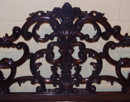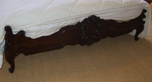 Circa 1930 Italian Queen size bed A truly unique Italian mahogany Queen Size bed, beautifully carved with scrolling foliage, in the Baroque Style dating 1920's/30's. Low footboard makes this ideal for those needing more length. Bed is supplied with new slats. A beautiful large ornate antique bed in lovely condition. Footboard: 19"High; 71" Width.