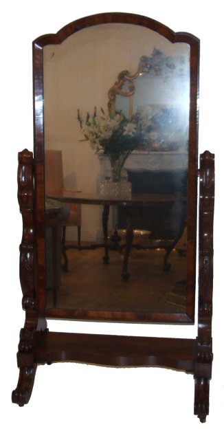 Circa 1845, an Early Victorian Period Cheval Mirror. This full length example is veneered in stunning "flame"