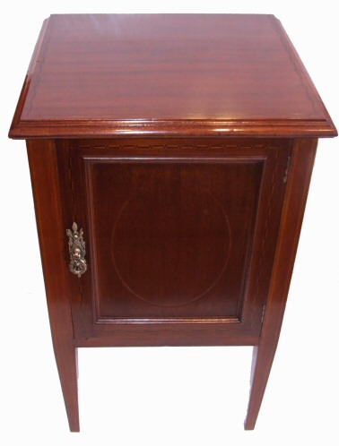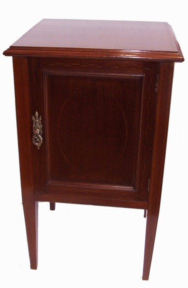 Attractive Edwardian inlaid mahogany bedside cabinet A pretty Edwardian Inlaid mahogany bedside cabinet with oval satinwood decoration to the front door and boxwood inlay to the door surround. The whole standing on elegant inlaid tapering legs. The door opening to reveal a shelved interior. A lovely conker colour and in beautiful condition. Height 27.5" Width 17" Depth 15.5" £250 (Ref : BED35) Email Us for a delivery quote : Click Here