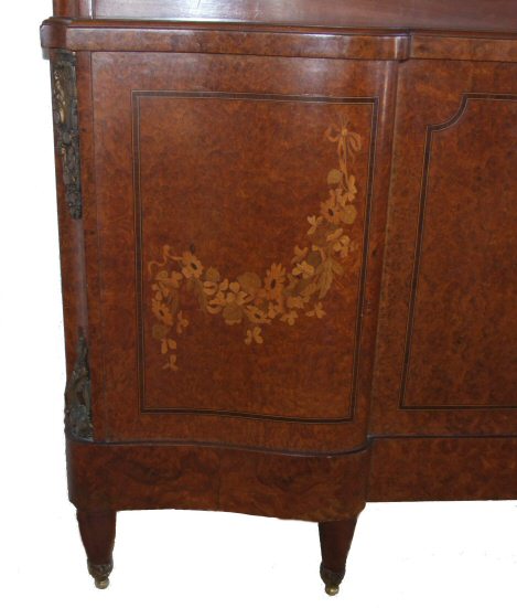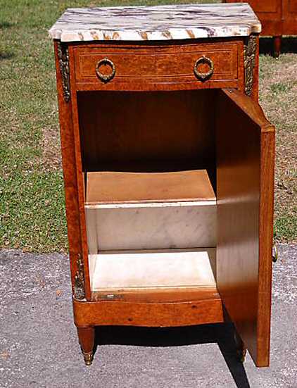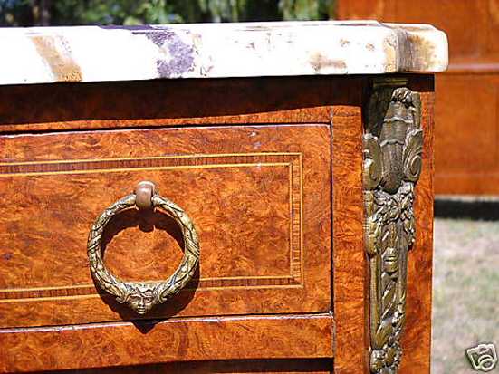 Beautiful Empire style Antique French Burr Maple Double Bed and bedside cabinet A stunning antique French Double bed in burr maple. A beautiful honey colour with lovely marquetry inlay panels depiting floral garlands. These are placed on the headboard and footboard and again on the bedside cabinet. Of excellent quality and good design. The bed itself has a high headboard with rosewood banding. The brass mounts on the top and of the headboard and the footboard depict shells with tassels all in brass, the headboard is surmounted by a lovely brass decorative pediment of leaf and berries with central brass garland. There is so much to see on this bed that on first glance you could miss the detailing. The footboard again has lovely marquetry panels of floral garlands, the same wonderful brass mounts as are found on the headboard and it is of serpentine outline. The whole stand on 6 brass capped feet which look elegant and graceful and make the bed very sturdy when assembled. The bed will be provided with new slats and the is easy to assemble, coming apart in four sections, headboard, footboard and 2 side rails. We check in the workshops that the bolts all fit well and that the frame is solid and sturdy and it is easy to assemble. The bedside cabinet is of excellent quality being a marble top example with internal marble also. The marquetry floral garland to the door is simply beautiful and it stands on the same brass capped legs that the bed has. The same brass mounts to the bedside cabinet and the whole is of serpentine outline. Simply stunning! Dimensions of both to follow. £2200 for both (Ref :BED361) Email Us for a delivery quote : Click Here