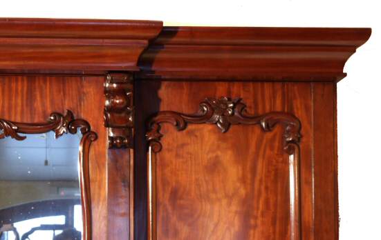 Victorian Flame Veneer mahogany combination wardrobe A stunning mid 19th Century combination wardrobe of deep conker colour highly figured with central glazed door and flanked either side by full hanging sections. The doors are highly figured mahogany veneer and the central door has beautiful corbelles to the top and bottom. The attractive applied beading is of foliate design and the whole diviides into 5 sections for ease of moving. The central section with original glass in excellent condition opens to reveal linen trays over a chest of drawers. In beautiful condition with locks working and drawer runners checked.