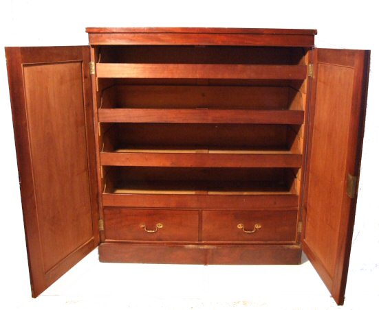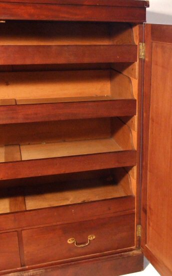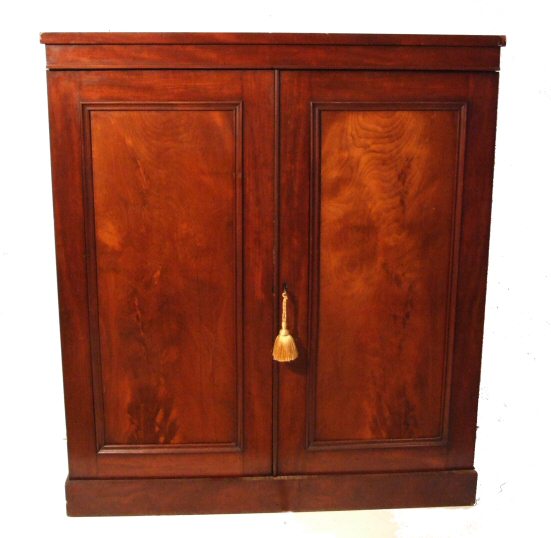 19th Century mahogany Dwarf Linen Press All the glory of 19th Century flame veneers (absolutely stunning), not too fussy, clean symetrical lines, panel doors, raised on a plinth this beautiful dwarf linen press is a fabulously versatile piece of furniture. The doors open to reveal 4 origianl linen trays lined in pale ash with beautiful figured mahogany fronts to match to outer body above 2 deep drawers with brass swan neck drop handles. A stunning piece in excellent condition and lends itself to a variety of uses apart from storage of blankets and clothes the trays can be removed (and stored) and a rail added to turn it into full hanging above the drawers, or the trays can be removed (and stored) and internally the aperture is 46.5" W x 37.25" H x 19.25" deep making it an ideal candidate for a tv cabinet. Height 55" Width 49" Depth 21.75" (Ref :BED530) Email Us for a delivery quote : Click Here