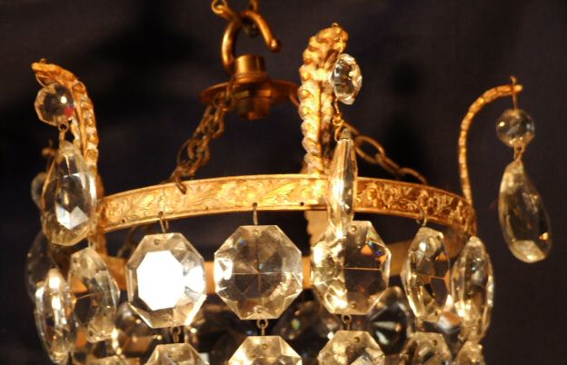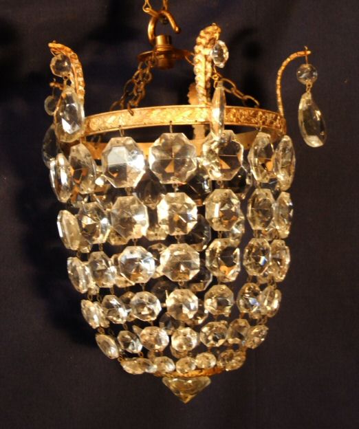 Edwardian purse chandelier A beautiful example of an Edwardian purse chandelier with graduated hexagonal faceted drops joined at the base via a brass ring and large glass prism. The brass frame having 5 lovely large accanthus leafs with small almond drops dressing them. Rewired and ready to install this is a beautiful antique chandelier that will look lovely in any setting. £185 H 10" min plus chain Width 8" Price £185 (Ref :CHA1020)