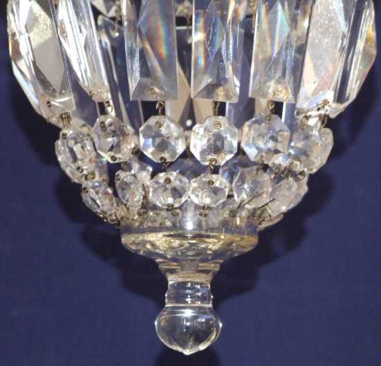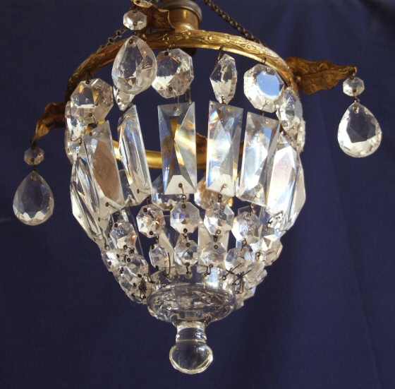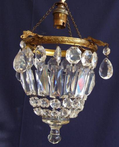 Beautiful Antique "purse" chandelier with gilt ivy leafs This gorgeous antique chandelier has a single bulb with lovely rectangular faceted drops alternating with hexagonal flat back drops all helping to form a wonderfully compact attractive chandelier with glass ball to the base. The frame itself is gilt with 4 unusual and attractive ivy leafs dressing it with further faceted drops this time "almond" in shape. Beautiful. Rewired and ready to hang Measurements Height 12" min plus chain Price £185 (Ref :CHA103) Email Us for a delivery quote : Click Here