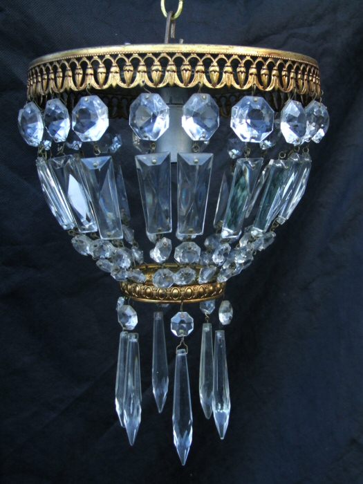 Circa 1930 Platformier Chandelier Perfect for low ceilings, this lovely platformier chandelier dates to 1930 and has pretty brass fret work in the form of tassel decoration to the rim and again to the lower ring of the chandelier. This beautiful purse shaped chandelier is compact and easy to install, can be fitted flush to the ceiling or with extra chain is height isnt a problem. The icicles that dress the base add an extra 3" to the height of the chandelier and can be removed if necessary to help even more where ceiling height is a factor. Rewired and ready to install.