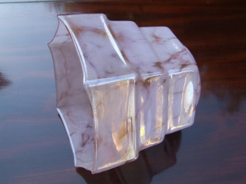 Mottled Pink Skyscraper Art Deco Ceiling Light Very attractive mottled pink Art Deco Ceiling Light of skyscraper form, the geometric shape typical of the Deco Period. The brass bayonet fitting slots in the top and holds firmly in place. A good size and in excellent condition. Height 7" Width 7.5"