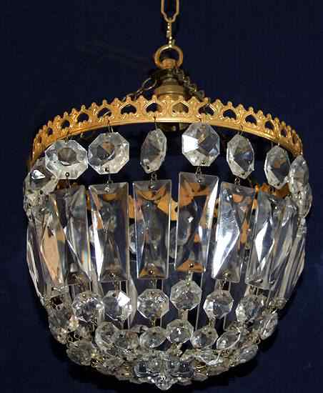 Antique purse chandelier A pretty antique single bulb chandelier of purse construction , the rectangular faceted drops with hexagonal flat back drops all joining at a central point by means of a decorative glass floral drop dress a pretty brass frame. Height 7" to frame plus chain Width 8"