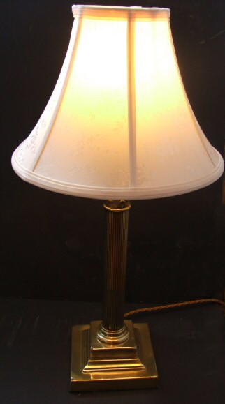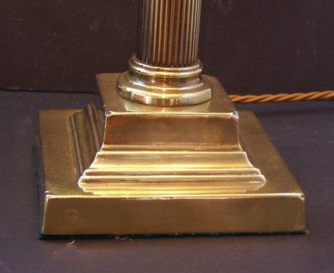 Excellent quality Edwardian brass Corinthian column table lamp Circa 1900 this impressive large solid brass Corinthian column table lamp stands on substantial stepped base and is baize lined. The circular reeded stem capped with acanthus detailing with later soft peach silk shade. Excellent condition, very heavy and rewired with soft gold silk flex. Height including shade 23" Base 6" Price £255 (Ref :CHA135) Email Us for a delivery quote : Click Here
