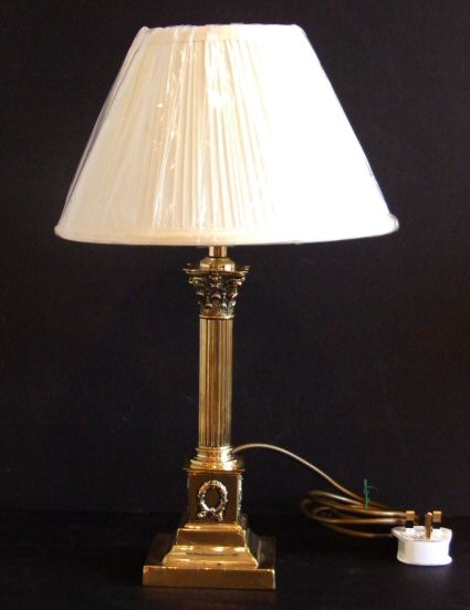 Stunning Edwardian Corinthian column table lamp A beautiful example of an Edwardian Corinthian column table lamp, having stepped based with rasied square section with garland decoration in brass on all 4 sides, the circular reeded stem terinating in accanthus capital. Rewired and ready to grace your home. The cream shade is new and a later addition. This is a lovely lamp and would look beautiful anywhere.
