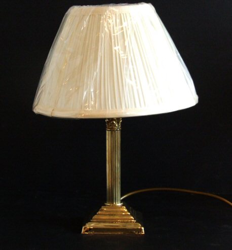 Small Edwardian brass corinthian column table lamp A beautiful Edwardian brass Corinthian column table lamp of small proportions. Standing on square stepped base with circular reeded stem terminating in accanthus detailing. Provided with a cream pleated shade (new). A beautiful item. Height 13.5" to top of shade Base 4" Price £130.00 (Ref : CHA153) Email Us for a delivery quote : Click Here