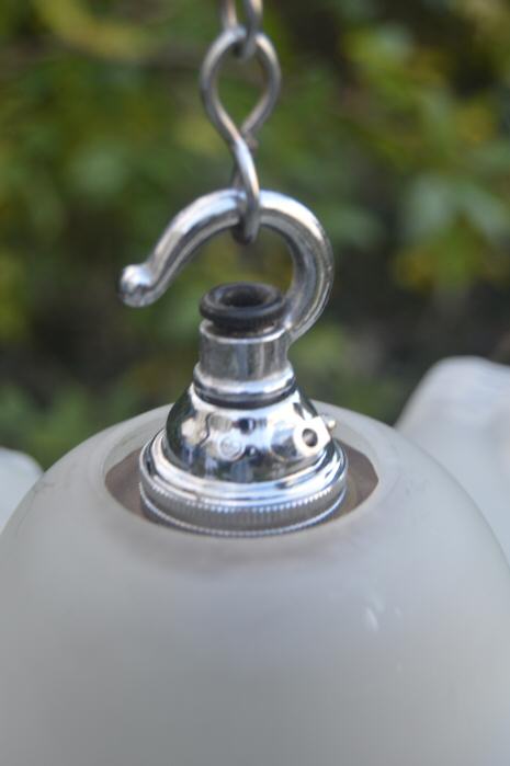 Stunning Edwardian Opaque Petal Ceiling Light Beautiful Edwardian Ceiling Light being opaque in colour with frilled edge highlighted in white which draws attention to the pretty detailing on this shade. This light hangs from a chrome fitting that holds the light firmly in place. Rewired and ready to install this really is a little gem! Width 9.5" Height 5.5" min plus chain Ref CHA2305 £135 Delivery £12