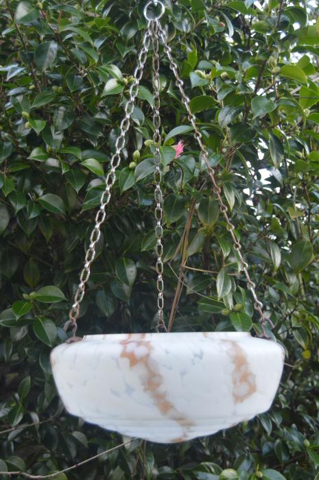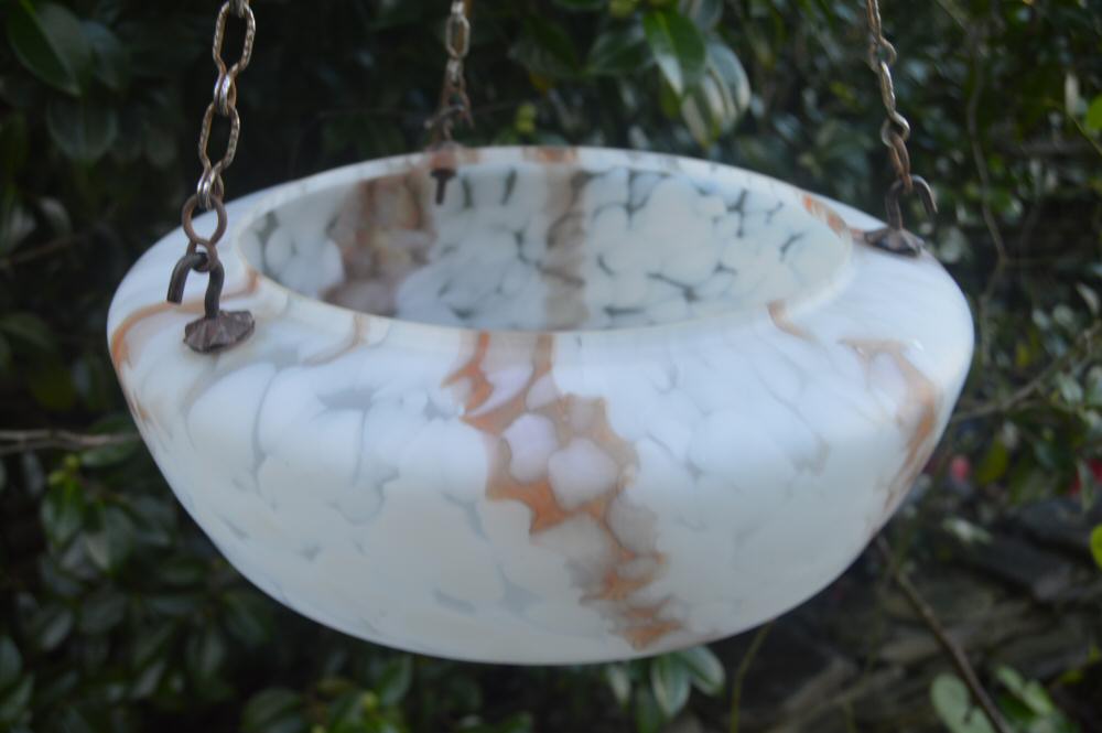 Art Deco Mottled White and Caramel Ceiling Light A pretty mottled white deco lampshade dating to 1930 with lovely caramel veins running through the shade, comes with 3 hooks and chain for hanging and will be rewired and ready to install. Dimensions are of the shade only, and dont include the chain. Width 12" Height 5.5" Ref CHA2307 £95 Delivery £10