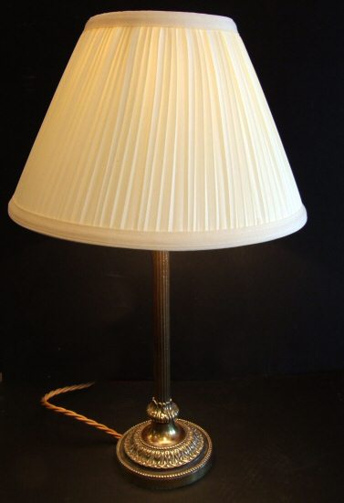 A beautiful antique brass table lamp A beautiful antique brass table lamp standing on circular base with accanthus detailing with slender reeded stem and additional cream pleated shade (new). Rewired and ready to grace your home Height 16" Width 4" SOLD (Ref : CHA268) Email Us for a delivery quote : Click Here