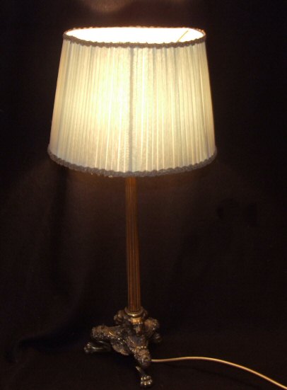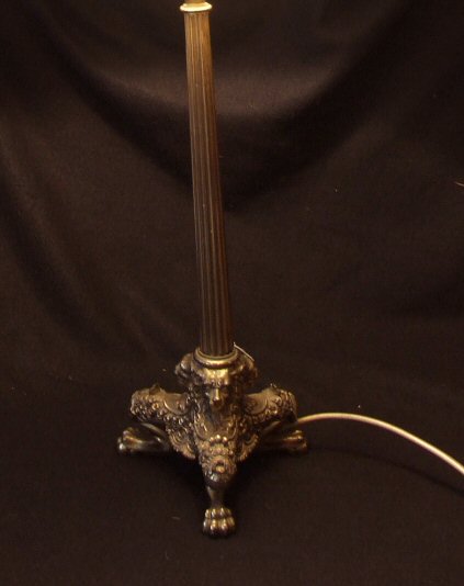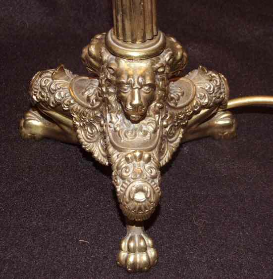 Stunning Brass Antique Table lamp These highly unusual and decorative antique brass table lamp has the most wonderful base comprising of 3 lion heads supported on 3 well defined lion paw feet. The tall and slender reeded stem adds elegance and height to this very decorative and desireable table lamp. Supplied with the original pleated soft green shade. Height 22.5" to top of shade Width 6.5" (base) (Ref : CHA28) Email Us for a delivery quote : Click Here