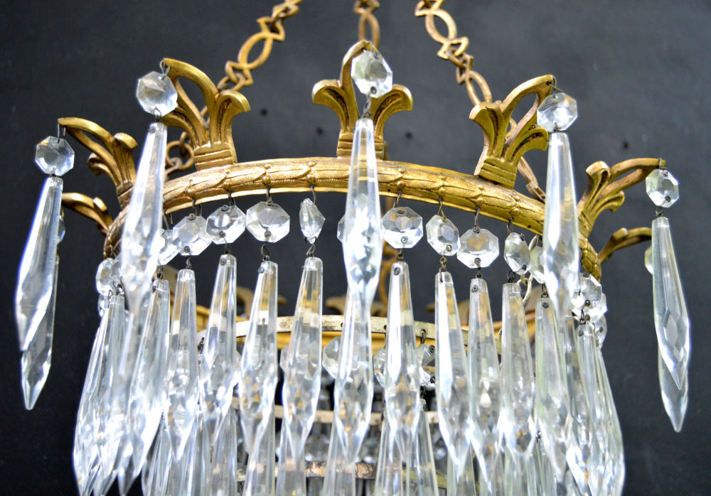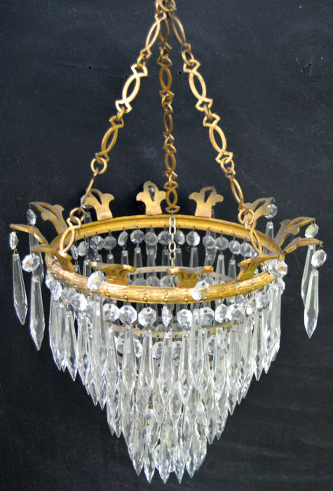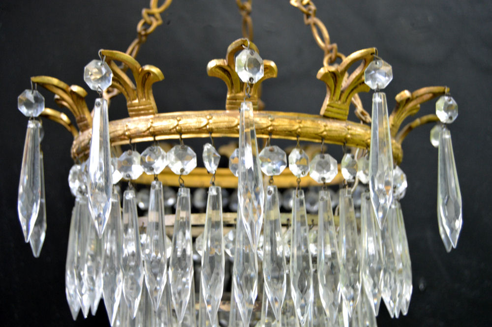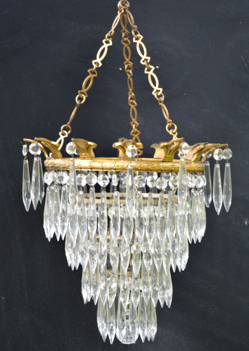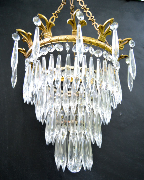Mid 20th Century 4Tier Icicle Chandelier A lovely 4 tier icicle chandelier dates to the middle of the Century. The beautiful patinated brass frame has 12 ornate brass crowns each dressed with lovely icicle drops and the whole supports 4 full rows of pretty faceted icicle drops with a faceted glass ball to its base. The original chain is excellent quality and gothic in style. This is a beautiful chandelier perfect to add a touch of sparkle and comes rewired with a silk antique style gold 3 core flex and brass bayonet, brass hook and chain and is ready to install by a qualified electrician.