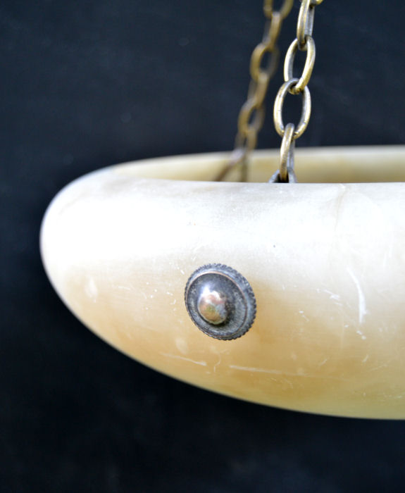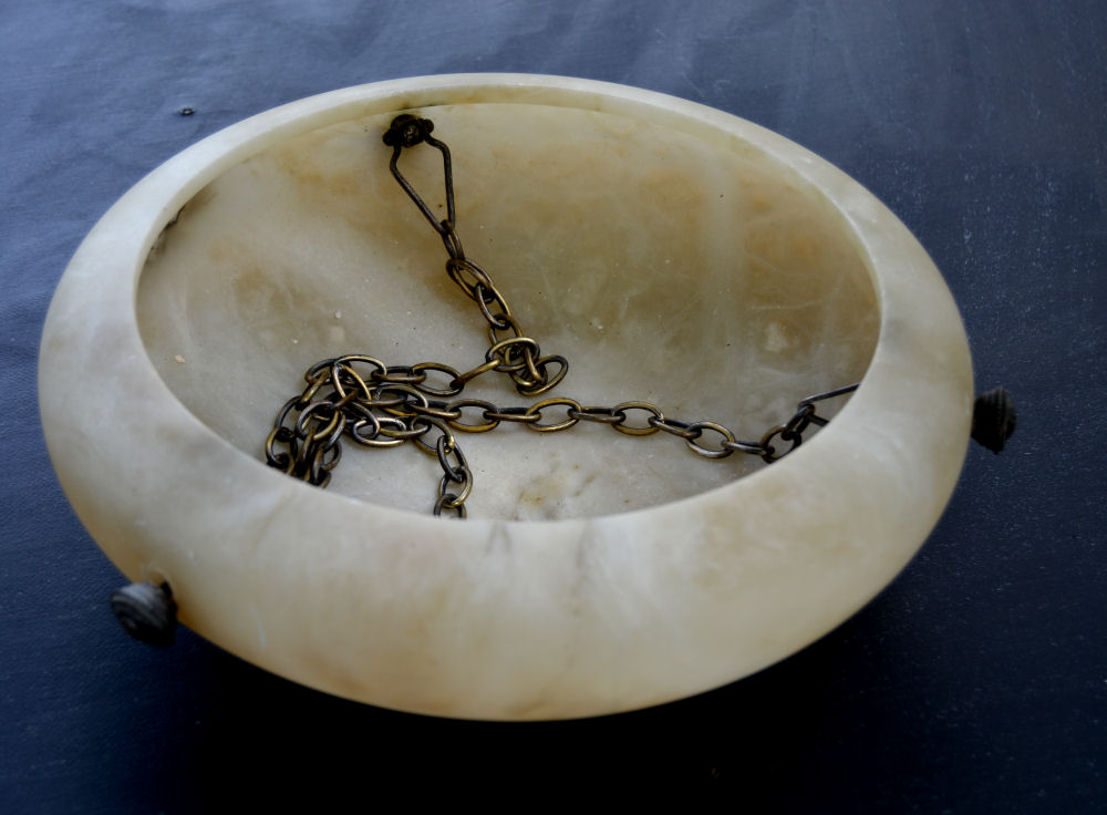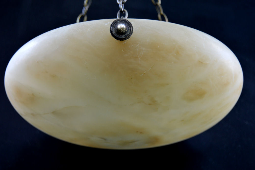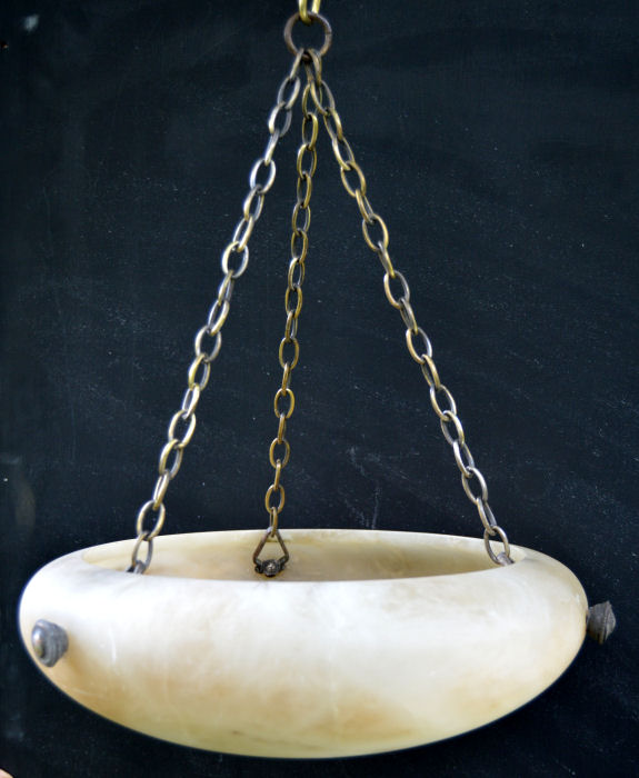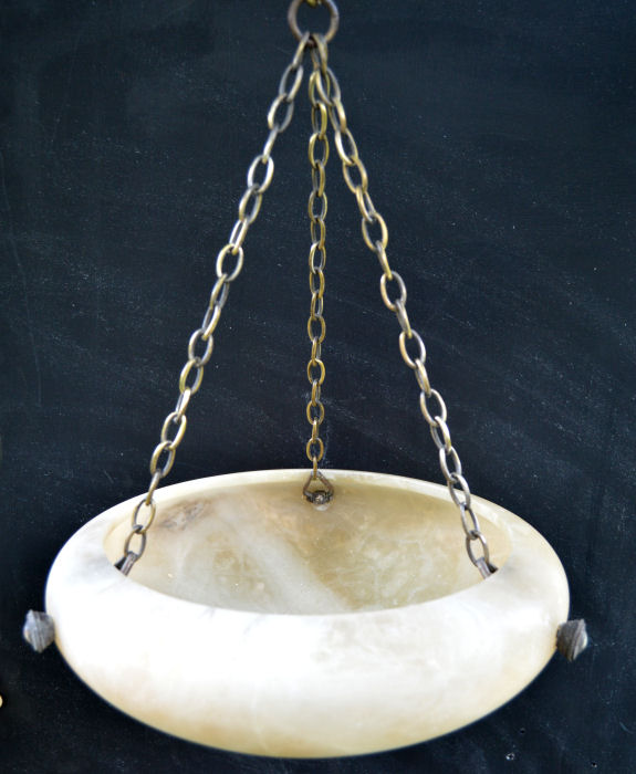 Edwardian Alabaster Shade An Edwardian Alabaster shade is a creamy sandstone colour with attractive veining. Chains are patinated silver plate.Will be supplied with antique style spiral silk flex and lampholder. Height 4" plus chains (or 15" including chain) Width 12.25" Ref CHA3015 £349 Delivery £9.98