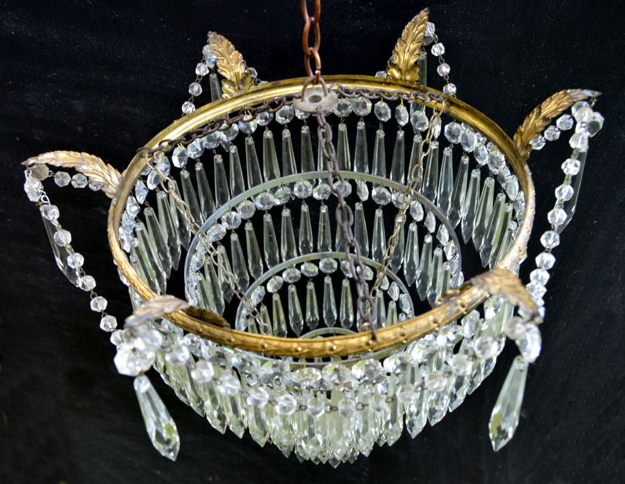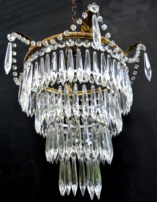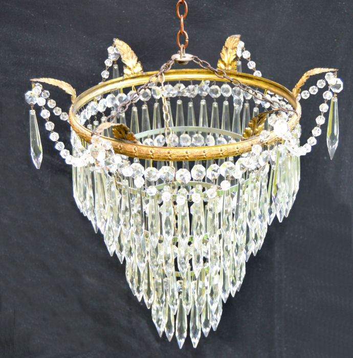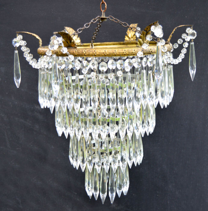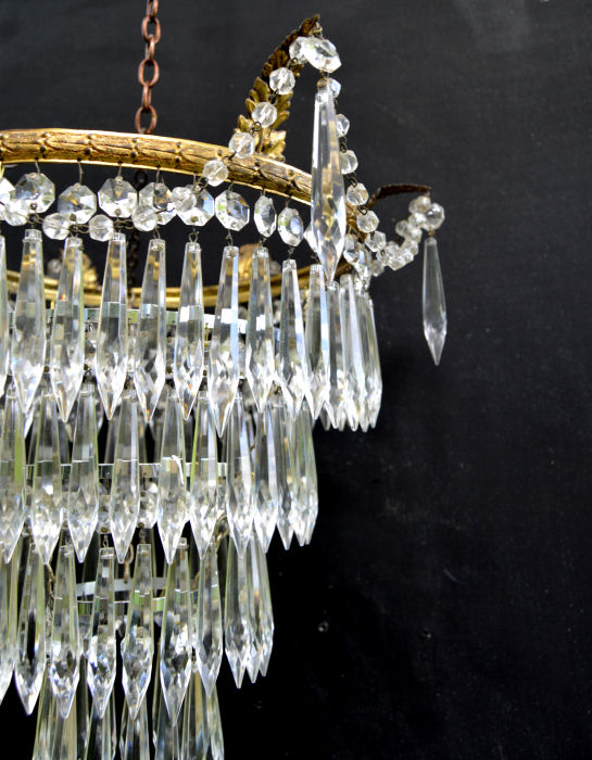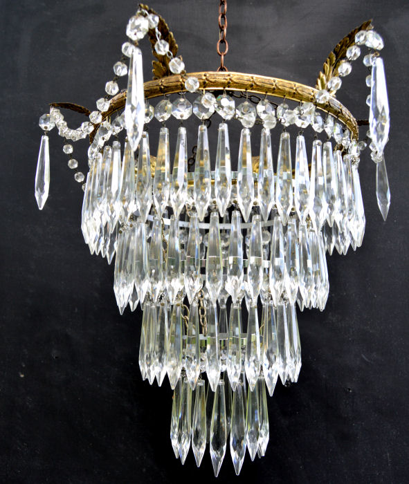 Stunning Edwardian 4 Tier Icicle Chandelier A stunning large Edwardian 4 tier icicle chandelier dating to the beginning of the Century. The beautifully patinated frame with accanthus detail has 6 well defined accanthus leafs with glass bead swags dressing the frame and 4 rows of pretty faceted icicle drops. This is a beautiful chandelier perfect to add a touch of sparkle and comes rewired with a silk antique style gold 3 core flex and brass bayonet, brass hook and chain and is ready to install by a qualified electrician.