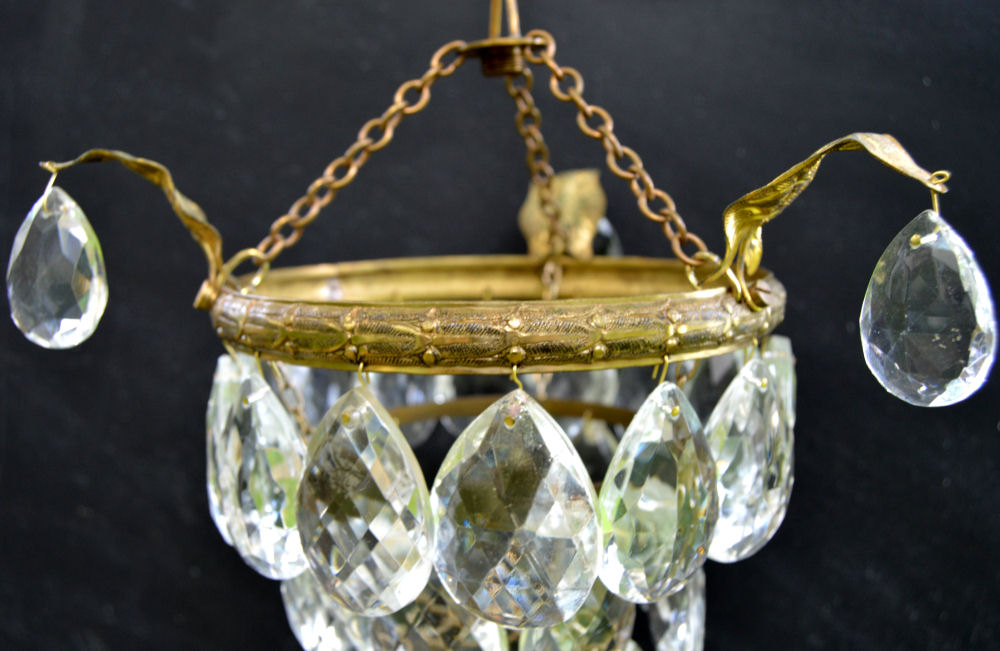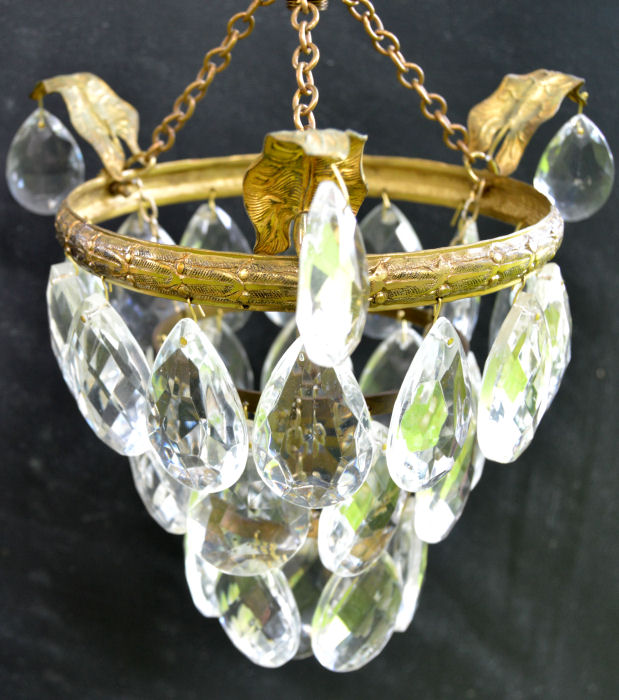 Petite 3 Tier Almond Drop Chandelier A petite 3 tier almond drop chandelier, small but beautiful. The brass frame has 3 attracitve ivy leafs decorated with further drops. Rewired with antique style 3 core silk flex and ready to install, with small brass hook and chain. Height 9" plus chain