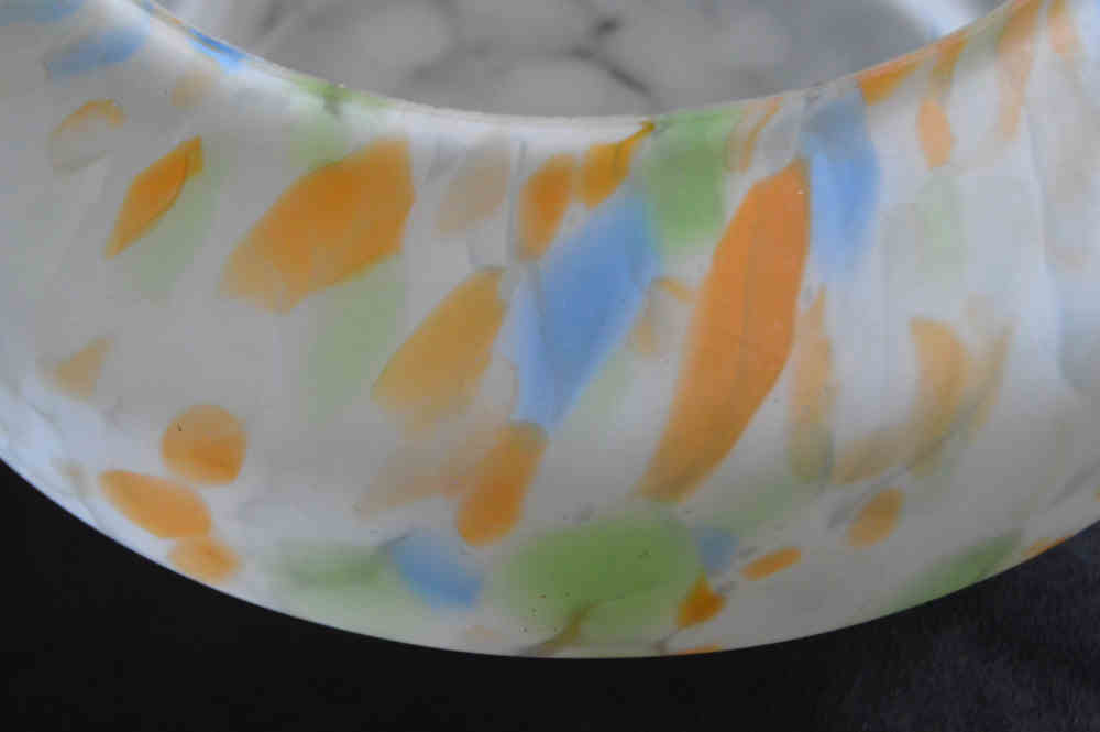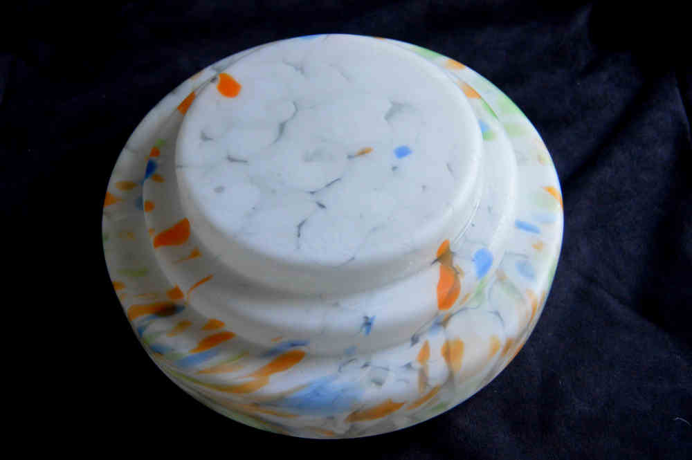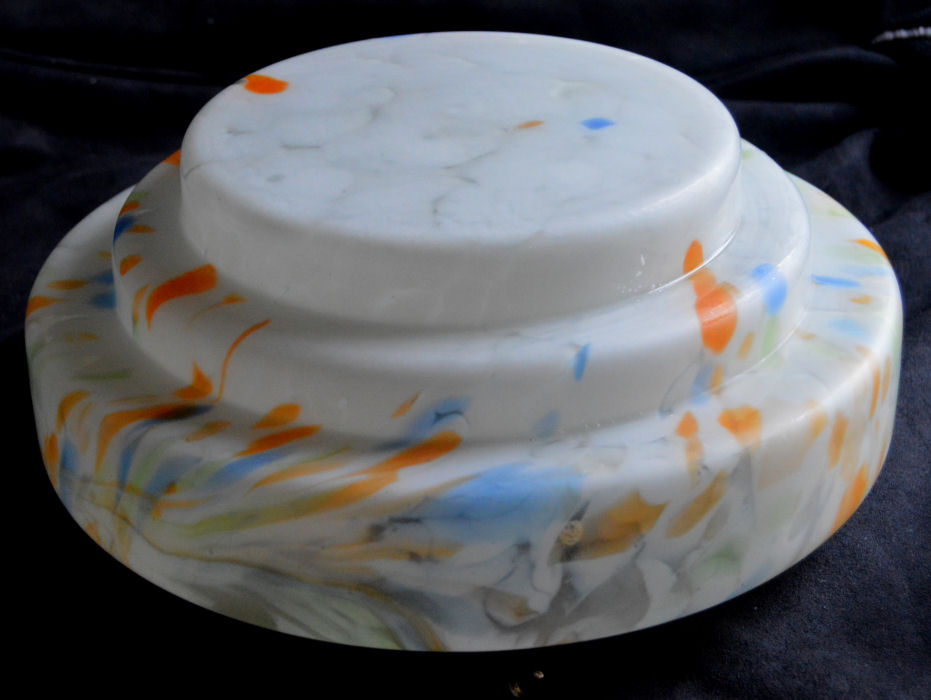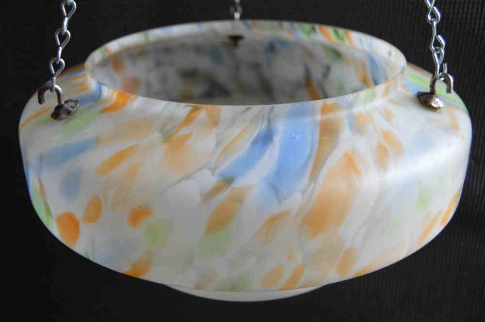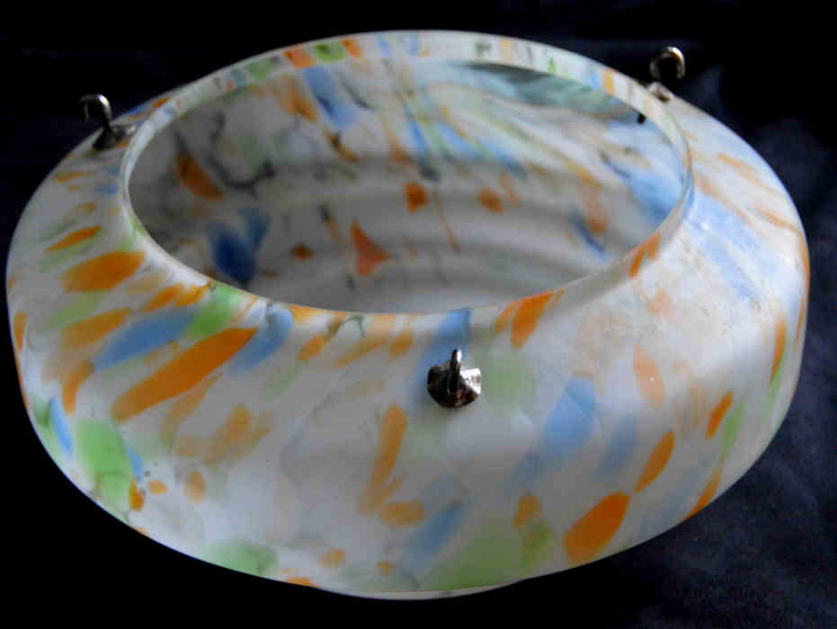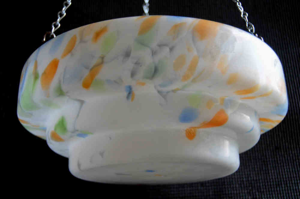 Art Deco Mottled White, Tangerine, Blue and Green Ceiling Light A gorgeous Art Deco Ceiling light dating to 1930, of stepped design, in striking mottled white, tangerine, sky blue and apple green. Comes with 3 hooks and chain for hanging and will be rewired and ready to install. Dimensions are of the shade only, and dont include the chain. Width 12" Height 5.5" Ref CHA3025 £125 Delivery £12