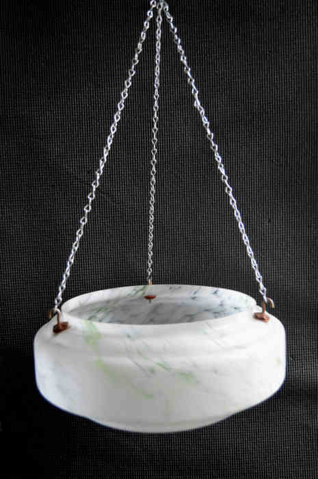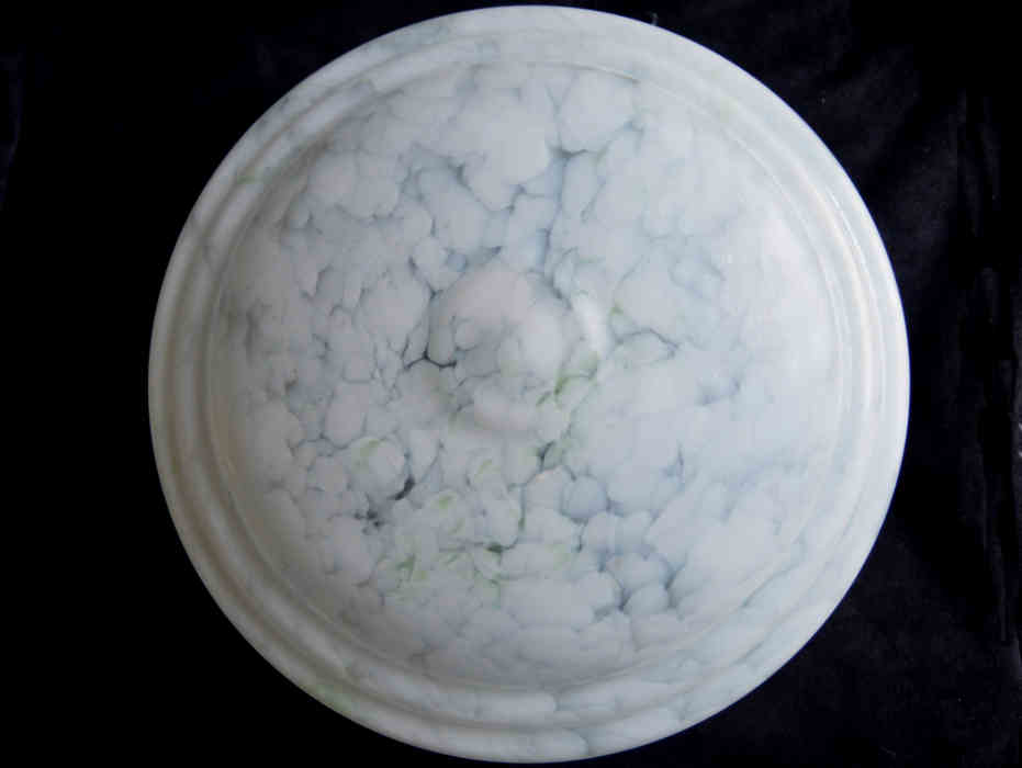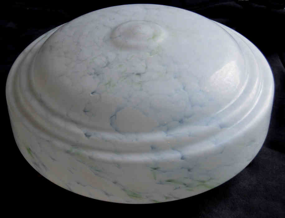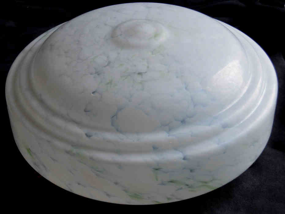 Large Art Deco Mottled White and Green Ceiling Light A gorgeous Large Art Deco Ceiling light dating to 1930, in striking mottled white with streaks of apple green. Comes with 3 hooks and chain for hanging and will be rewired and ready to install. Dimensions are of the shade only, and dont include the chain. Width 14" Height 6" Ref CHA3026 £125 Delivery £12