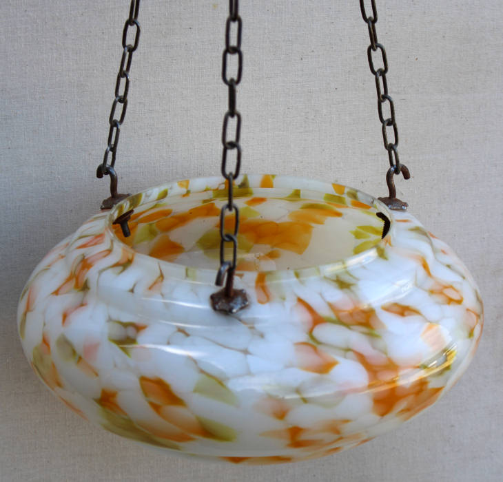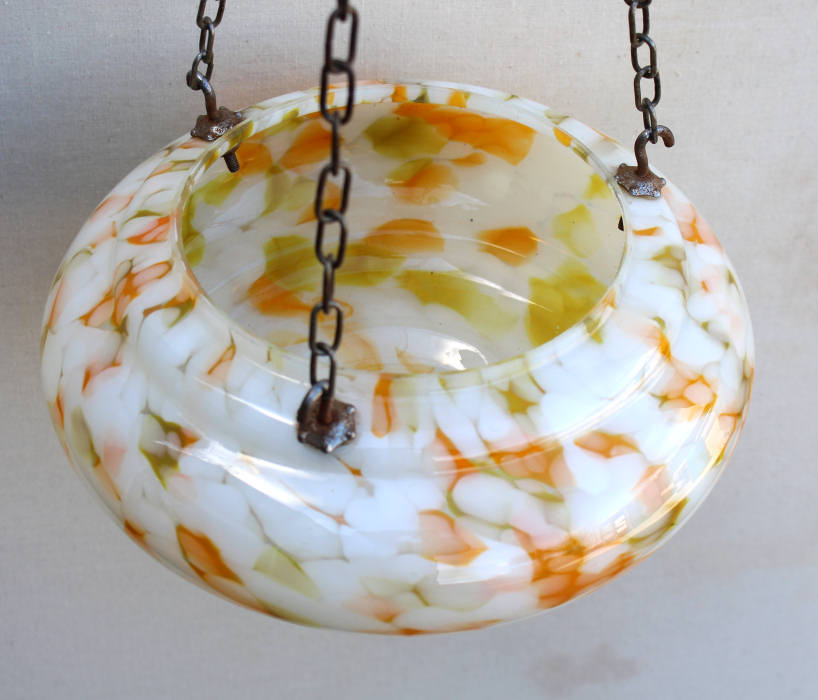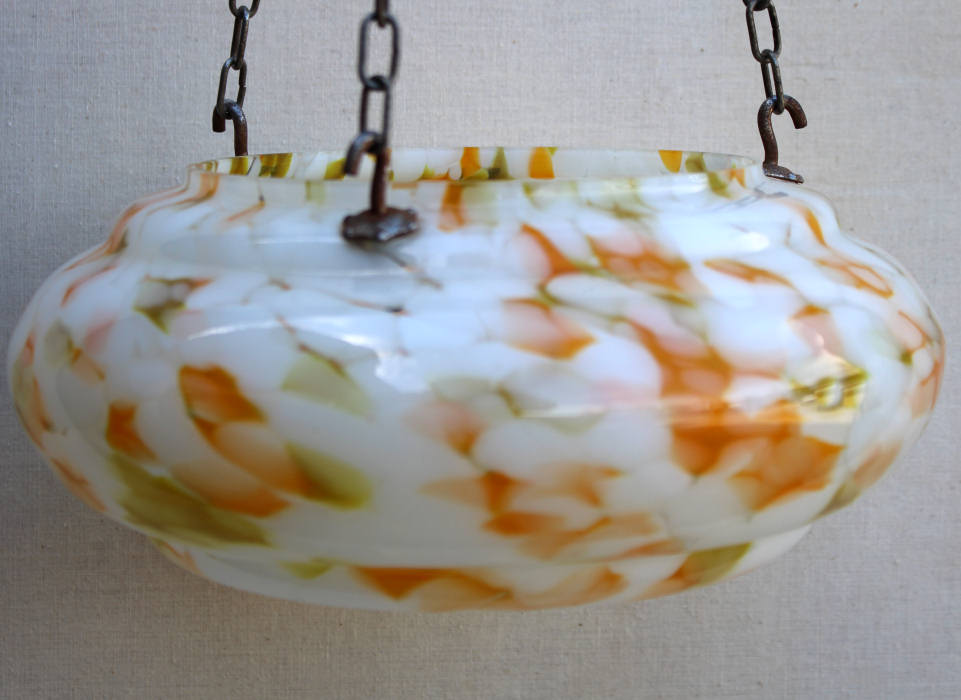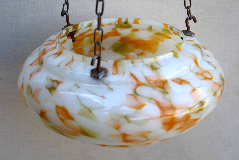 Small Art Deco Mottled White, tangerine and lime Ceiling Light A small Art Deco ceiling light dating to 1930, lovely mottled white shade with tangerine and lime swirls, a lovely compact curved Art Deco shade. Rewired with a gold 3 core antique silk flex and chrome bayonet. Height 5" shade sides plus chain Width 10" Ref CHA3029 £125 Delivery £10