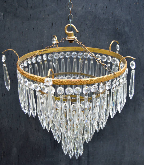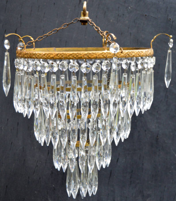 Edwardian 4 Tier Icicle Chandelier A lovely 4 tier icicle chandelier dating to the beginning of the Century. The beautifully patinated frame with accanthus detail has 5 small brass arms dressed with further icicle drops and the whole frame is dressed with 4 rows of pretty faceted icicle drops. This is a beautiful chandelier perfect to add a touch of sparkle and comes rewired with a silk antique style gold 3 core flex and brass bayonet, brass hook and chain and is ready to install by a qualified electrician.