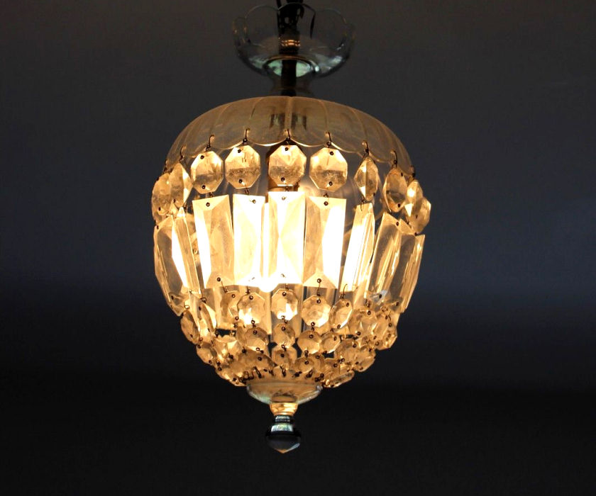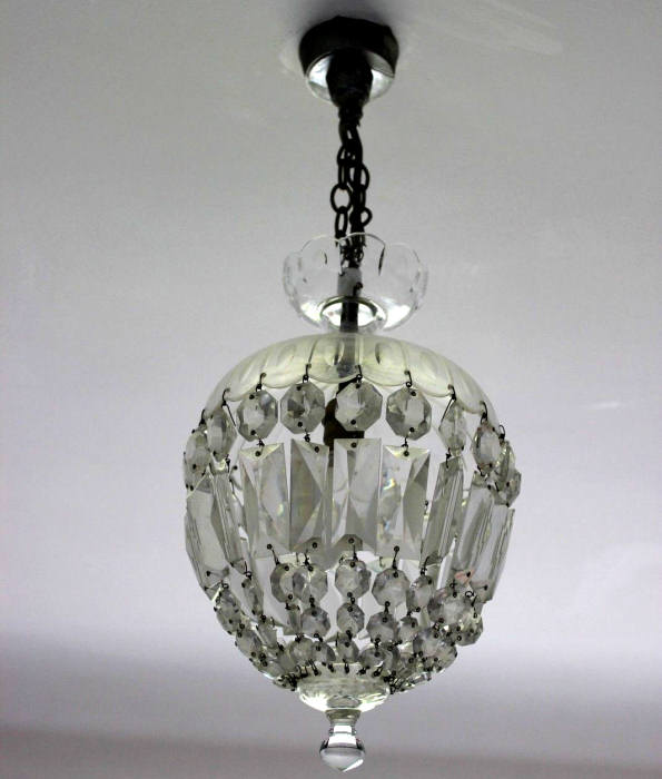 Circa 1930 Crystal Chandelier Perfect for low ceilings, this lovely crystal chandelier dates to 1930. This beautiful purse shaped chandelier is compact and easy to install. The beautiful strings of hexagonal crystal drops are attached to a dome shaped glass top with upturned crystal dish (which can be fitted straight to a ceiling hook where height is an issue or extra chain can be added). The purse is made by attaching the strings of crystals to a glass dish. Rewired and ready to install. Height TBC Width 24cm PRICE £225 DELIVERY £10.00 CHA3043
